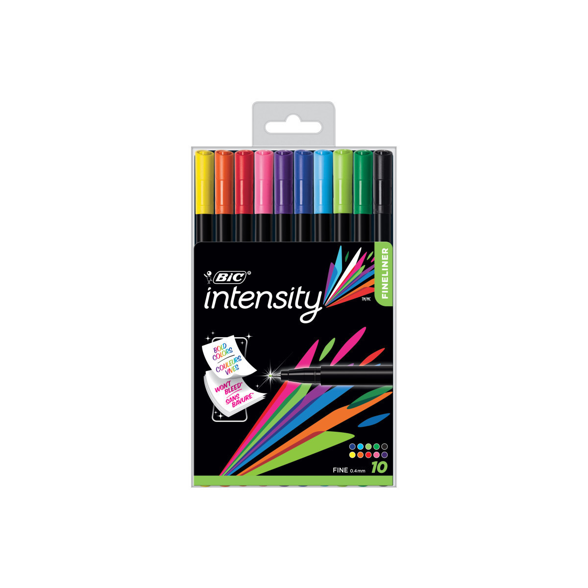 BIC Intensity® Fineliner Fine writes like a pen, and is bold like a marker. This pen has bold colors, that won't bleed through paper* (*Results could vary based on paper characteristics). The pen features a fine tip (0.4mm) that provides smooth, colorful precision. The metal nib protects the tip from wearing down. This pen is perfect for notetaking, creative writing, adult coloring, and journaling. The water-based ink makes it perfect for writing on paper and is AMCI approved non toxic.