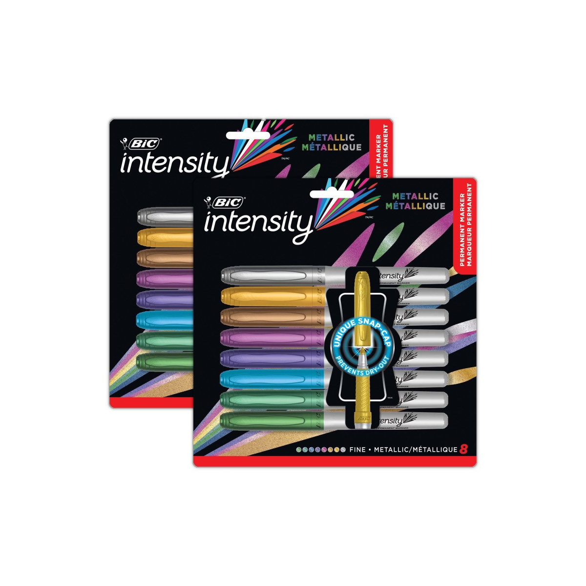 BIC® Intensity® metallic permanent markers with fine point. Features include: Low odor, non-slip grip, and quick dry ink. These markers are long lasting and fade resistant. Each pack includes 8 markers in assorted colors. Sold as 2 packs for a total of 16 markers.