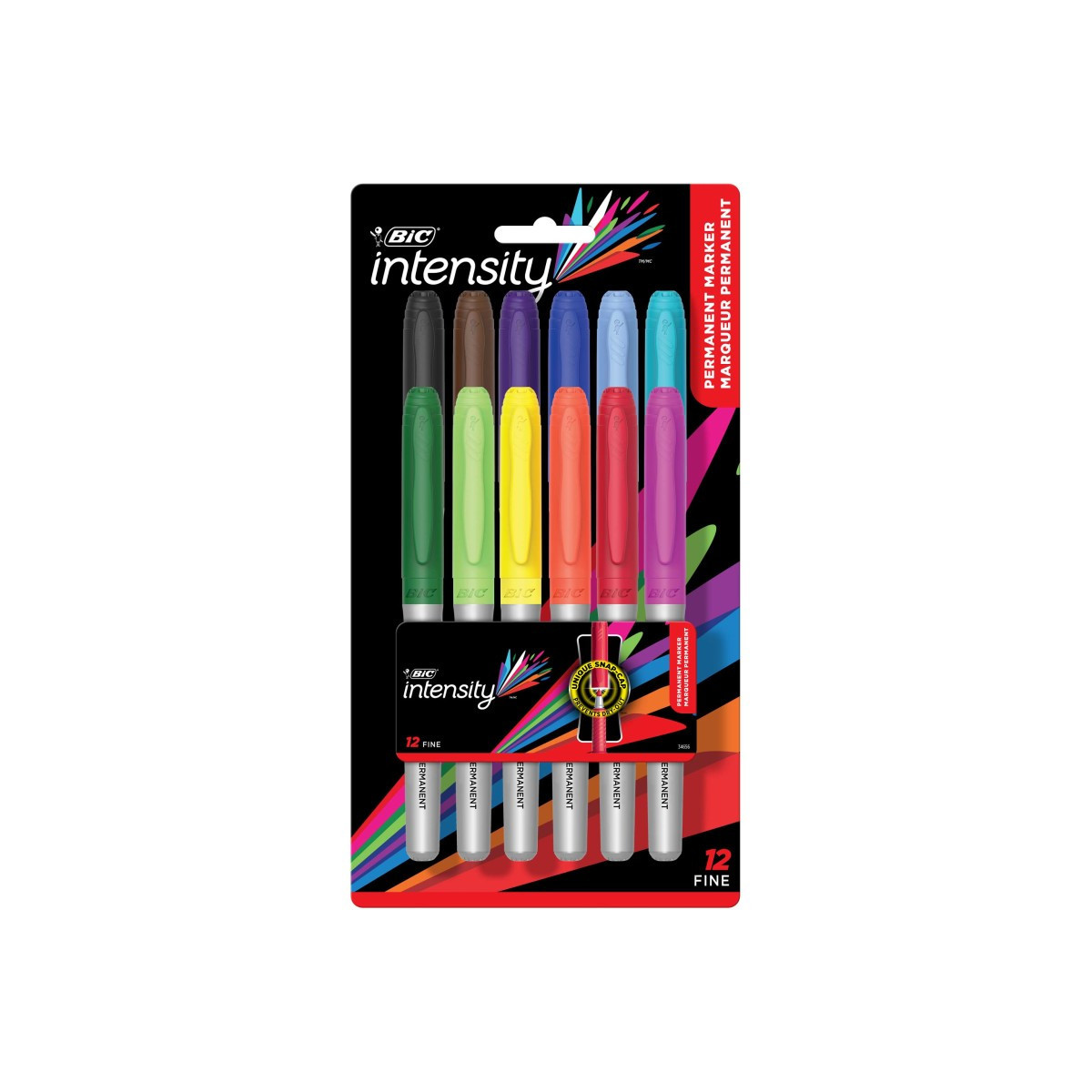 BIC® Intensity permanent markers with fine point. Features include: Low odor, non-slip grip, and quick dry ink. These markers are long lasting and fade resistant. Comes in a 12-pack of assorted colors.
