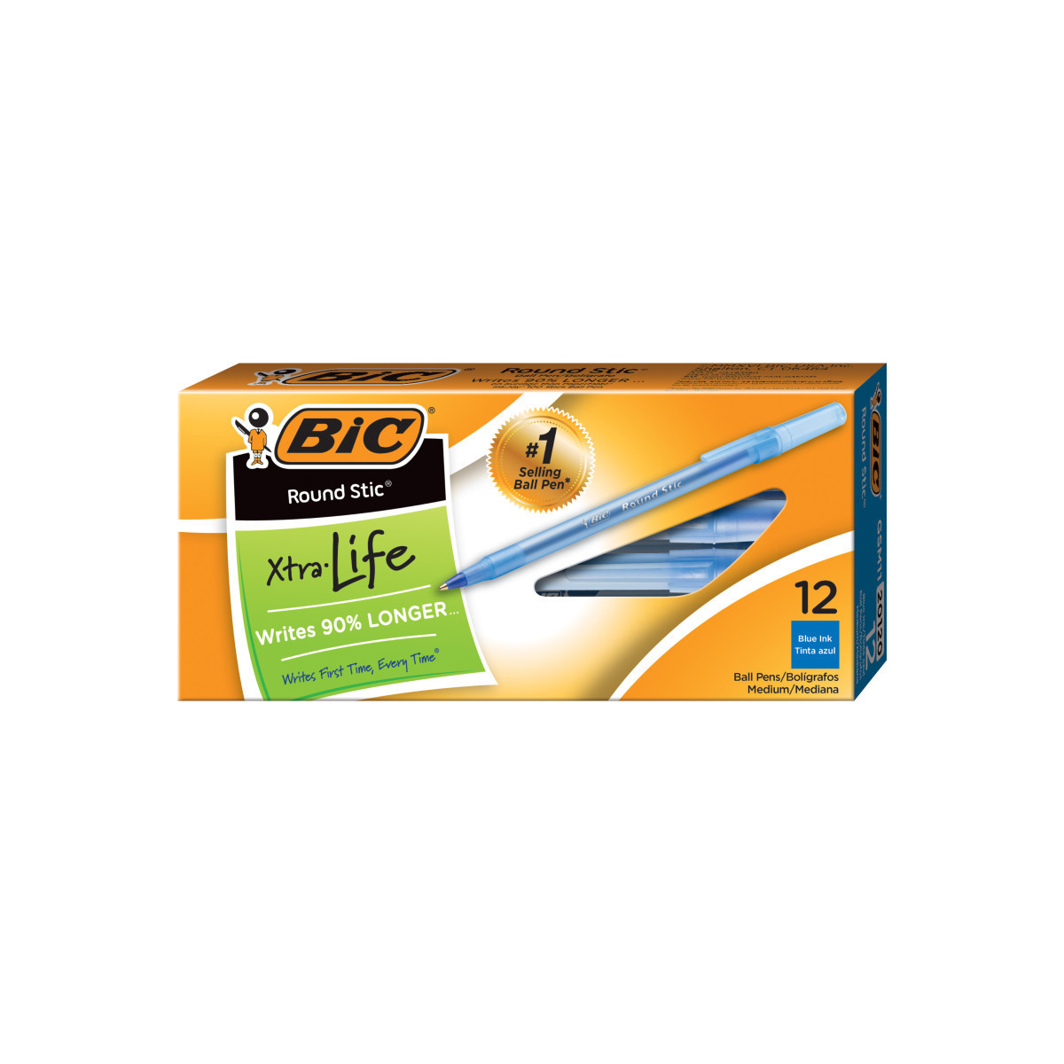 BIC® Round Stic® pens are a lightweight round barrel pen for comfortable writing. Tough, durable tungsten carbide point insures the smoothest of writing. Features a medium point and the cap and end plug color indicate the ink color. It is easy to identify and is designed for long-lasting dependability. Features a ventilated cap and tungsten carbide ball. 1 Dozen blue Pens.