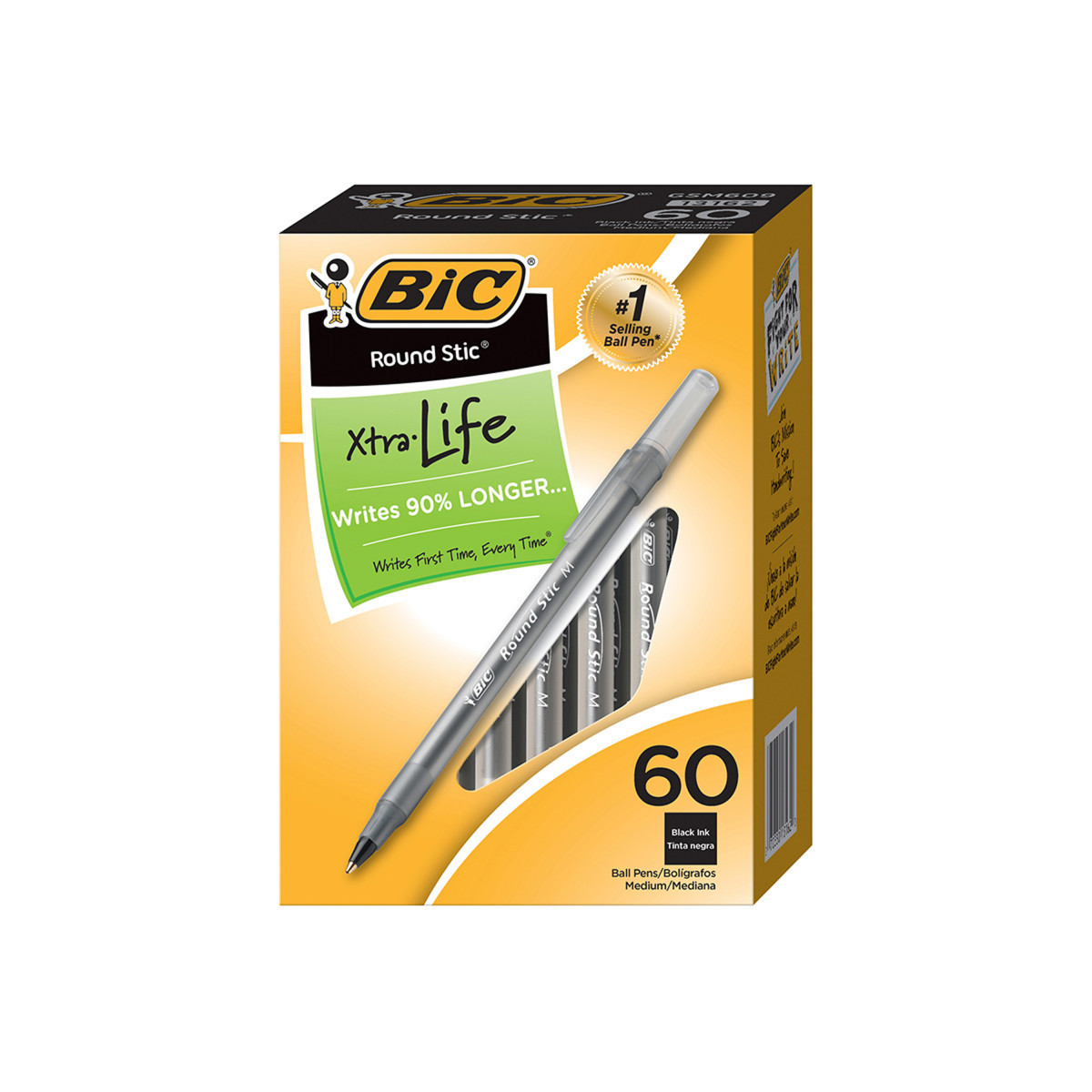 The BIC Round Stic Xtra Life Ball Pen is a dependable favorite that offers performance and value. This pen writes 90% longer on average than Papermate® InkJoy® 100 Ball Stick Pen.** It features a versatile 1.0mm medium point that creates vivid lines, making it ideal for a variety of writing applications from note-taking to doodling. The pen comes with a reliable tungsten carbide ball point that spreads the ink smoothly and evenly. The flexible round barrel rests comfortably in your hand, while the translucent barrel shows the remaining ink supply, so you know when you're running low. BIC Round Stic Xtra Life Ball Pens are non-refillable.