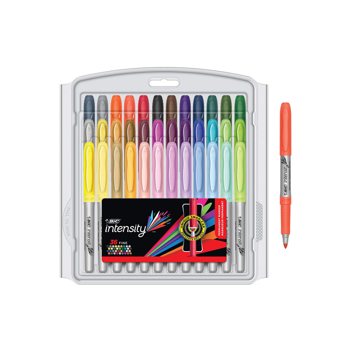 Perfect for adult coloring books and craft projects, BIC Marking Permanent Markers bring a bold, colorful flair to your creations. This permanent marker set unlocks your creative options with a vibrant assortment of fashion-inspired colors. Each marker comes equipped with a fine point and a soft rubber grip that enhances your control. The low-odor, acid-free ink (no added acid, no measurable pH) is capable of marking on almost any surface--from glass and metal to photos and foils. With 36 colors at your disposal, you'll have all the choices you need to bring your doodles, art projects, and coloring pages to life. Includes 36 BIC Marking Permanent Markers, 1.1 mm Point Size, Assorted Fashion Colors.