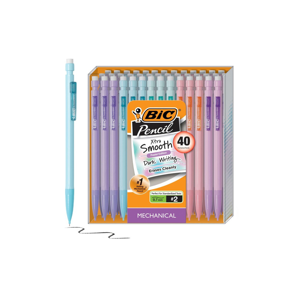 BIC® mechanical pencil Xtra Life pastel edition. 0.7mm #2 smooth writing black lead with quick advance action. Erases cleanly, writes dark and is approved for standardized tests. Attached clip for storage. Comes in assorted pastel colored barrels. Each pack includes 40 pencils.