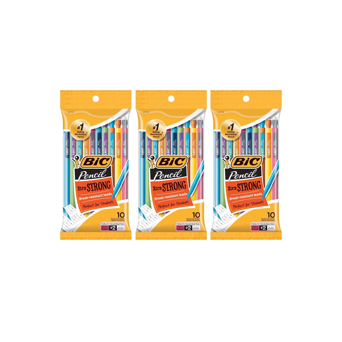 BIC Xtra-Strong Mechanical Pencils come equipped with strong 0.9mm leads that resist breaking and are perfect for students. Always sharp, ready, and accurate, these #2 pencils offer smooth-writing lead that does not smudge and erases cleanly, making them the smart choice at test time and ideal for standardized tests. The Xtra-Strong Mechanical Pencil also delivers dependable performance and convenience – one BIC Pencil equals 2.5 wood case pencils – and it is always ready to write when you are. The lead never requires sharpening and advances easily with just a click. Students of any age will love the bright, colorful barrels with contrasting clip colors. Each pack includes 10 pencils. Sold as a set of 3 packs, 30 pencils total.