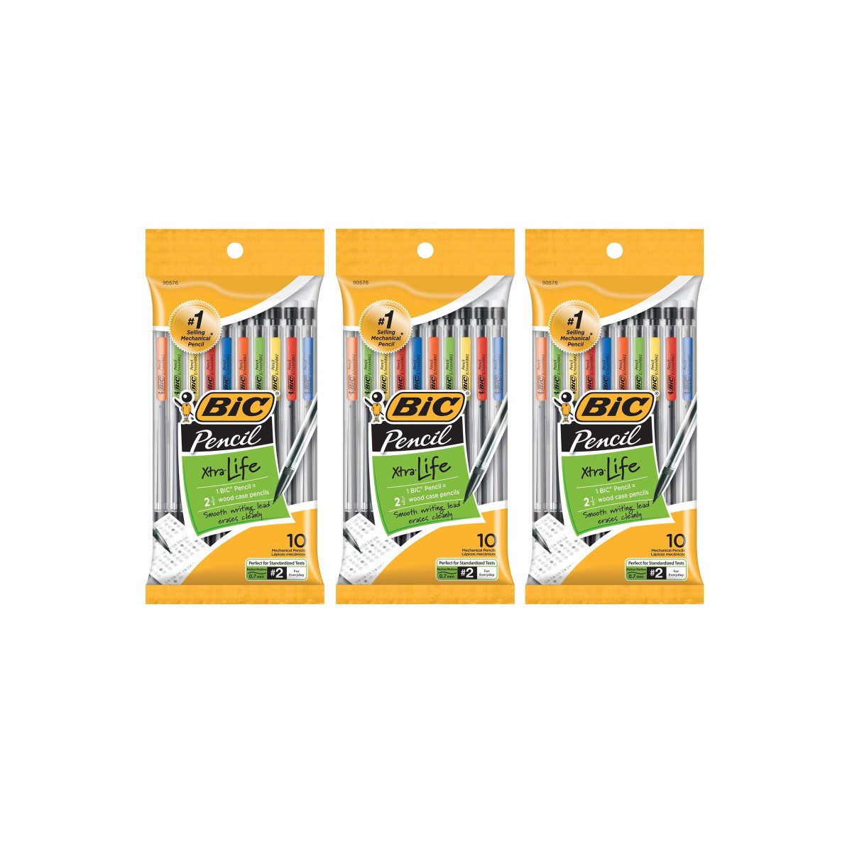 Enjoy smooth writing with the durable BIC Xtra-Life Mechanical Pencil. One BIC pencil equals 2.5 wood case pencils, offering performance and value. With a fresh 0.7mm point only a click away, this #2 pencil is perfect for standardized tests and eliminates the need to sharpen constantly, ensuring you're always ready to write, draw, sketch, or doodle. The smooth-writing lead does not smudge and erases cleanly. The clear barrel is accented with a colorful clip, making it easy to attach the pencil to notebooks and binders, and each pencil comes with three #2 leads. Each pack includes 10 pencils. Sold as a set of 3 packs, 30 pencils total.
