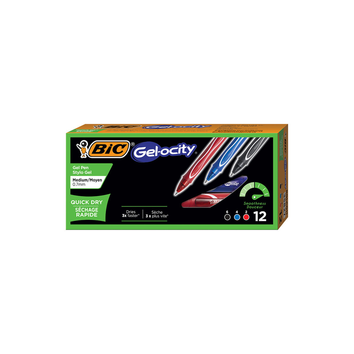 Gel-ocity® Quick Dry Retractable Gel dries up to 3x faster for less smearing vs. BIC® Gel-ocity® Original based on average dry times of blue, black and red. Individual dry times may vary by color. Provides a super smooth writing experience. This pen has a comfortable full grip barrel and comes in vibrant, fun colors. Pens are 0.7 mm medium point. Pack includes 12 pens: 6 Black, 4 Blue, and 2 Red.
