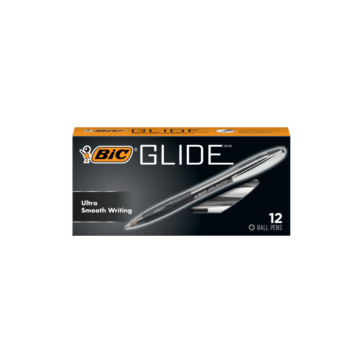 The trusted original with a classic look and feel, BIC Glide Retractable Ball Pens offer fluid, effortless writing for everyday writing tasks. The Glide is BIC's #1 selling retractable ball pen and comes filled with ink that writes even smoother than BIC classic ink system. Each pen features a rubber grip that offers a comfortable hold-ideal for longer writing sessions-and a 1.0mm medium point that is versatile enough for a variety of writing activities. The pen's smooth-click retractable design offers convenience, while the metal clip adds a touch of sophistication. Each pack includes 12 black pens.