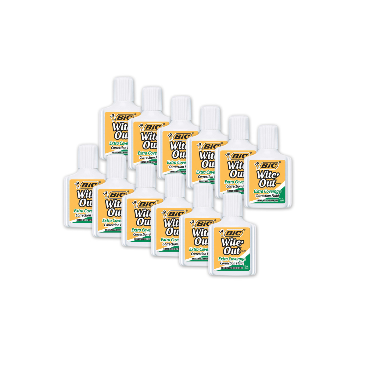 BIC® Wite-Out® Brand Extra Coverage Correction Fluid covers the toughest mistakes, i.e. red ink and permanent marker. Applies evenly and dries to a satin smooth finish with a wedge shaped foam applicator. Covers photocopies, faxes, ink, permanent marker and more. 20 ml bottle. Sold as a pack of 12 bottles.