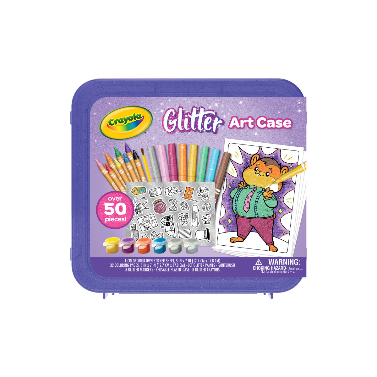 Sparkle and shine with the Crayola Glitter Art Case! This enchanting set includes 6 Glitter Paint Pots, Paint Brush, 8 Glitter Crayons, 8 Glitter Markers, 32 Coloring Pages featuring Dress Up Pets, 1 Color-Your-Own Sticker Sheet with Glitter Accents, and a Glitter Storage Case. The durable, portable case keeps everything neatly organized, making it perfect for creativity on-the-go. Kids will adore adding a touch of glitter to their masterpieces with these vibrant supplies. Encourage their creativity and self-expression with glittery crayons, markers, and paint that bring every project to life. Ideal for ages 5 and up, this art kit is a fantastic birthday or holiday gift for both girls and boys. Plus, all the supplies are safe and nontoxic, ensuring hours of worry-free fun. Let the glittery adventures begin and watch their imaginations sparkle!