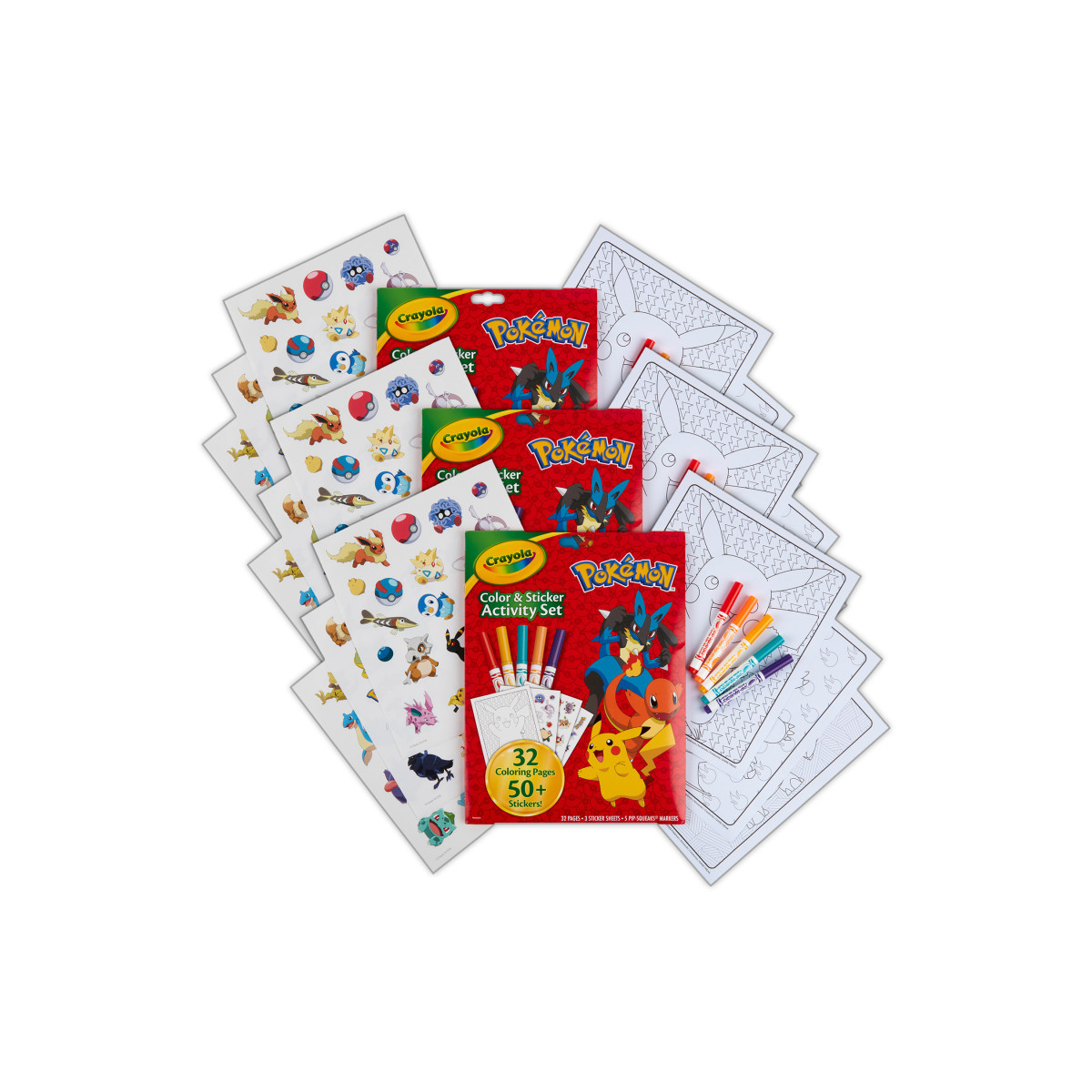 Little ones will love to color and decorate their favorite characters from Pokémon! Each Crayola Color & Sticker Activity Set offers 32 Coloring Pages, 5 Crayola Pipsqueak Markers, and 3 Sticker Sheets featuring Ash, Pikachu, and all their friends. There are over 50 stickers included in each set so kids can enhance their coloring artwork of their favorite Pokémon Partners! The folder-style design keeps coloring pages safe and organized for on-the-go entertainment or rainy days at home, so fans can color the adventures of Ash, Goh, Pikachu, Sobble, and friends wherever they roam! This Crayola Color & Sticker Activity Set comes with everything kids need to get started creating. A great gift for boys and girls who love the Pokémon Series. Safe and nontoxic, ages 3 and up. Sold as a pack of 3 complete activity sets.