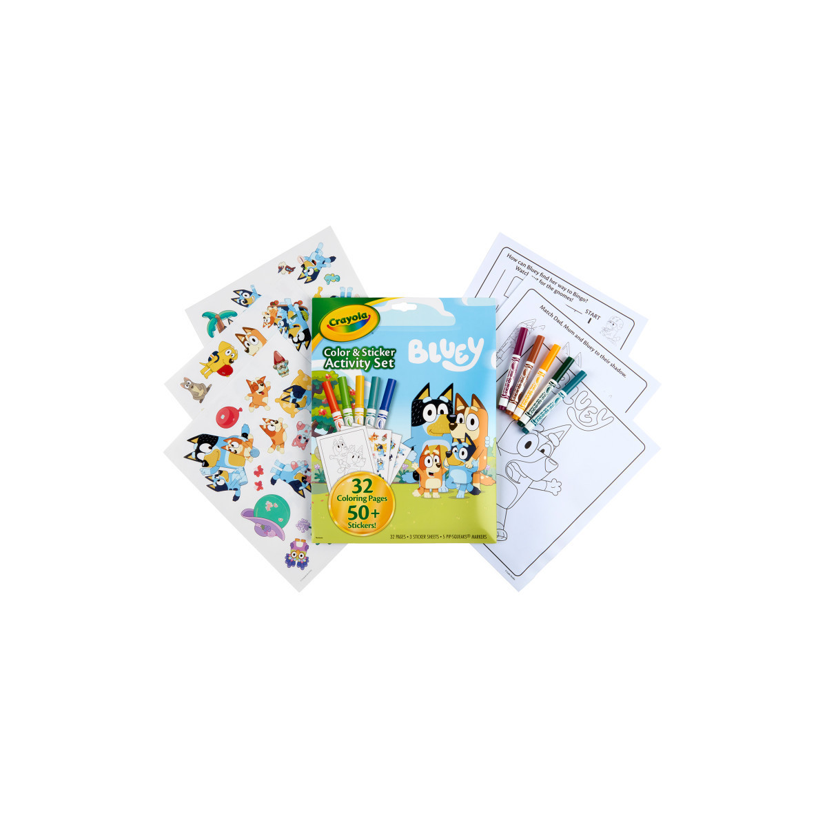 BLUEY ACTIVITY SET: Features 32 Bluey Coloring Pages, 5 Crayola Pipsqueak Markers, and 50+ Stickers of Bluey the dog, and other characters from the Bluey TV show