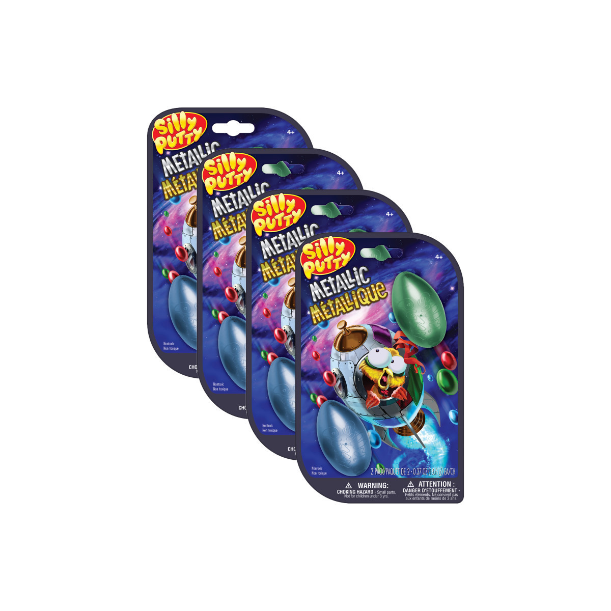 Step into a world of shimmer and shine with the Silly Putty Metallic Eggs from Crayola. Each set includes two metallic eggs, offering a unique tactile experience. Each set features 2 colored eggs in one of 3 colorways including: silver & gold, metallic purple & metallic red, or metallic green & metallic blue (no color choice). Celebrated for over 70 years, Silly Putty is known for its ability to bounce, mold, snap, and stretch, stimulating kids' imaginations while requiring no hand-eye coordination. It's more than just a toy; it's a tool for creativity, a catalyst for imagination, and a source of endless fun. Perfect for gifting, this set makes an excellent choice for stocking stuffers and party favors. Plus, it's nontoxic, ensuring safe play for your little ones. This product is recommended for children aged 4 and up. Sold as 4 packs for a total of 8 Silly Putty Eggs.