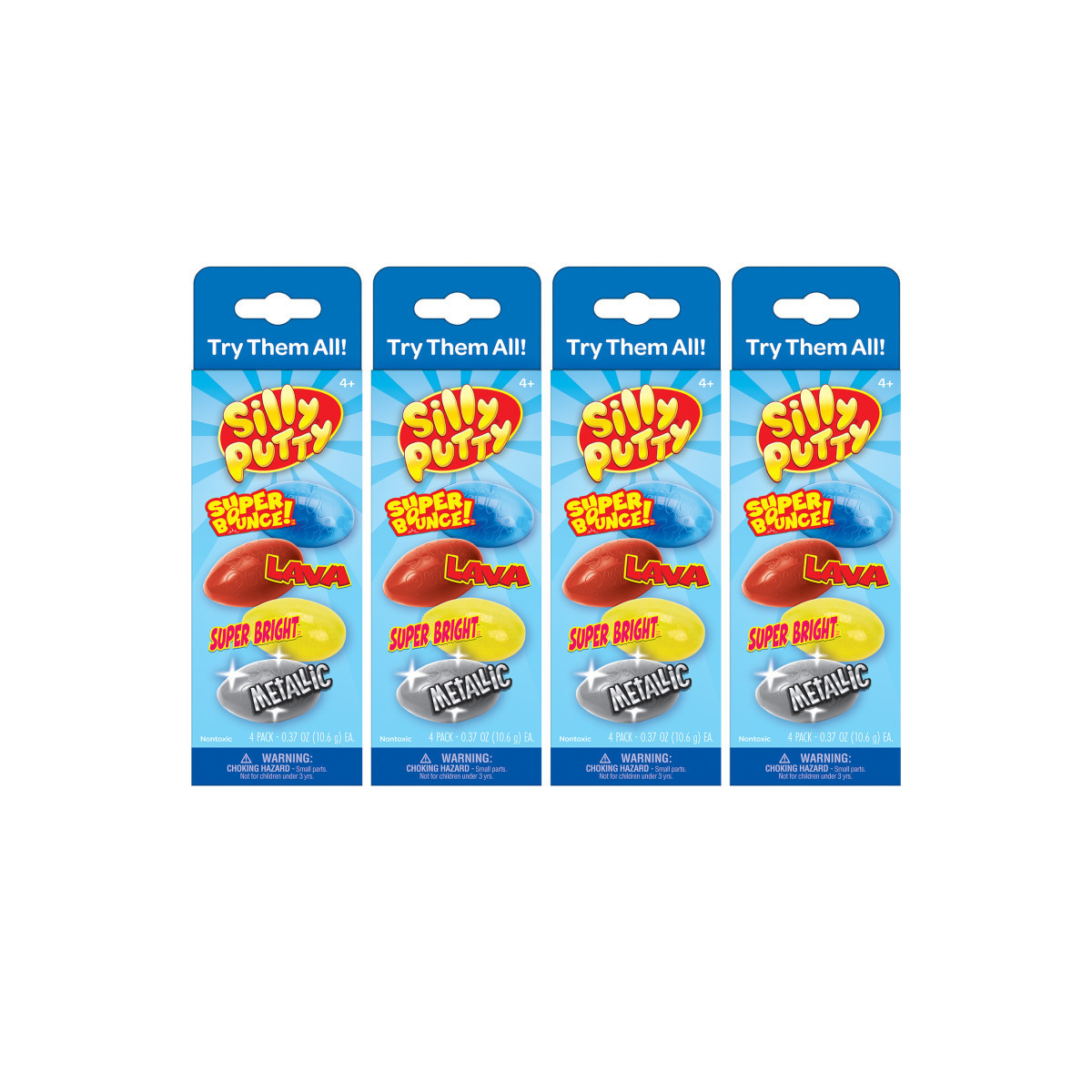 VARIETY PACK: Experience the joy of play and creativity with the Silly Putty Specialty Pack from Crayola. Sold as 4 sets, each individual set includes four unique specialty eggs: Superbounce (blue), Lava (orange), Superbright (yellow), and Metallic (silver).