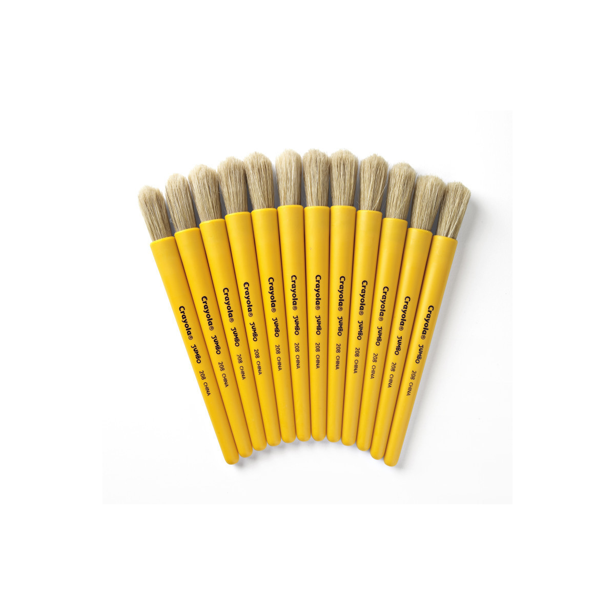 The Crayola Jumbo Brush features a plastic handle, and is ideal for painting large areas or making broad strokes with its natural bristles. Crayola art supplies and activities help children express, create, and connect through colorful play. This brush style is easy for young artists to handle and hold, and works with a variety of paint. White bristle hair - Round head. Pack of 12 paint brushes.