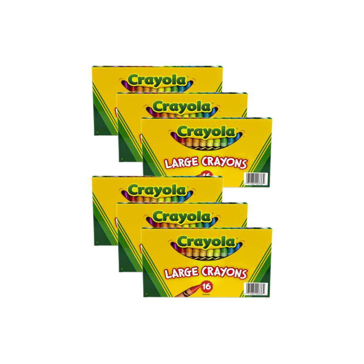 Kids love Crayola Crayons and parents love the hours of creative fun they provide. This crayon set has non-toxic, large crayons in classic colors to keep budding artists entertained for hours. The larger size is designed to make these crayons more comfortable for young artists developing their grip. 16 color choices make this set perfect for coloring books and kid's crafts. Perfect for the classroom and at-home crafts, this set would make a wonderful gift to students and teachers. Each pack includes 16 crayons in Black, Blue, Blue Green, Blue Violet, Brown, Carnation Pink, Green, Orange, Red, Red Orange, Red Violet, Violet, White, Yellow, Yellow Green, Yellow Orange. Sold as 6 packs for a total of 96 crayons.