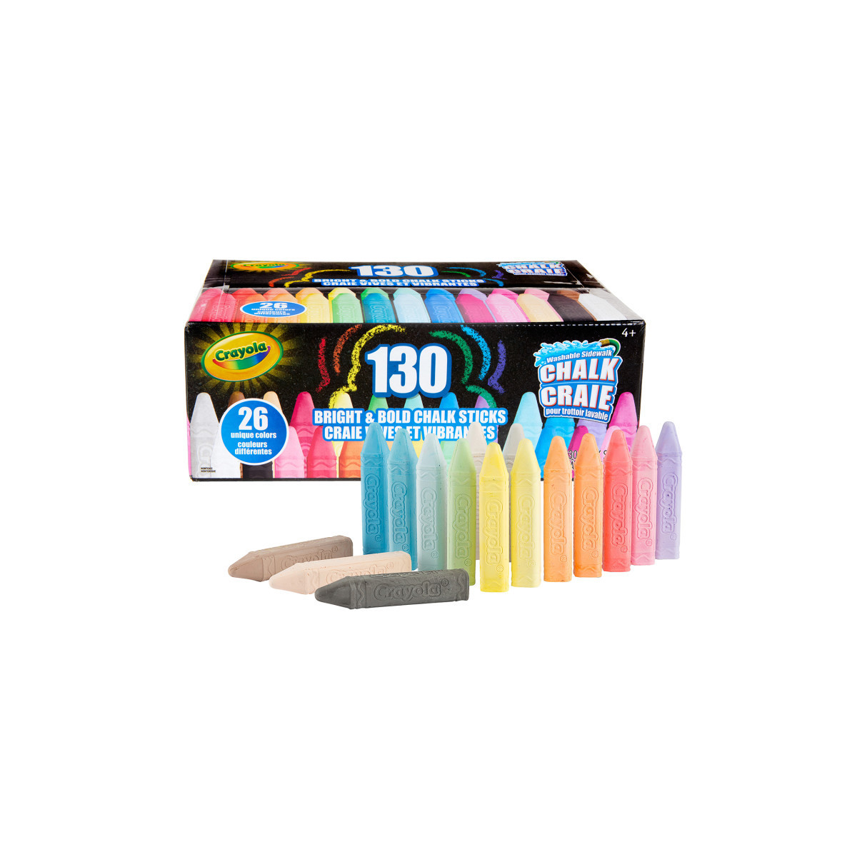CRAYOLA WASHABLE SIDEWALK CHALK: Enjoy this set of 130 vibrant outdoor chalk sticks, featuring 26 unique chalk colors (5 of each color per box).