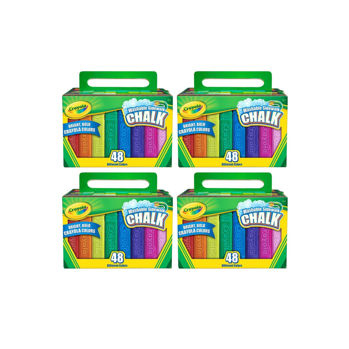 Go big and bold with Crayola Washable Sidewalk Chalk. Ideal for sidewalks and driveways, this set gets kids outside for artistic, imaginative fun. Create big, colorful murals and write large handwritten messages in vibrant shades. Draw brightly hued foundations for traditional chalk games, including hopscotch, tic-tac-toe, and four square. This set includes a diverse range of colors, from classic red, yellow, to the blue hues. These Crayola colors pop against sidewalk and driveway surfaces. A safe and convenient choice for kids, this chalk has a special anti-roll shape to prevent it from rolling down driveways or other inclined surfaces. Kids can keep their chalk close at hand as they draw fine lines and broad strokes. Crayola Washable Sidewalk Chalk washes clean from sidewalks and driveways. For fast and easy cleanup, use a water hose to spray away the color. Crayola art supplies and activities help children express, create, and connect through colorful play. Each box includes 24 Sidewalk Chalk sticks in exclusive Crayola crayon colors. Sold as 4 boxes for a total of 192 sticks of chalk.