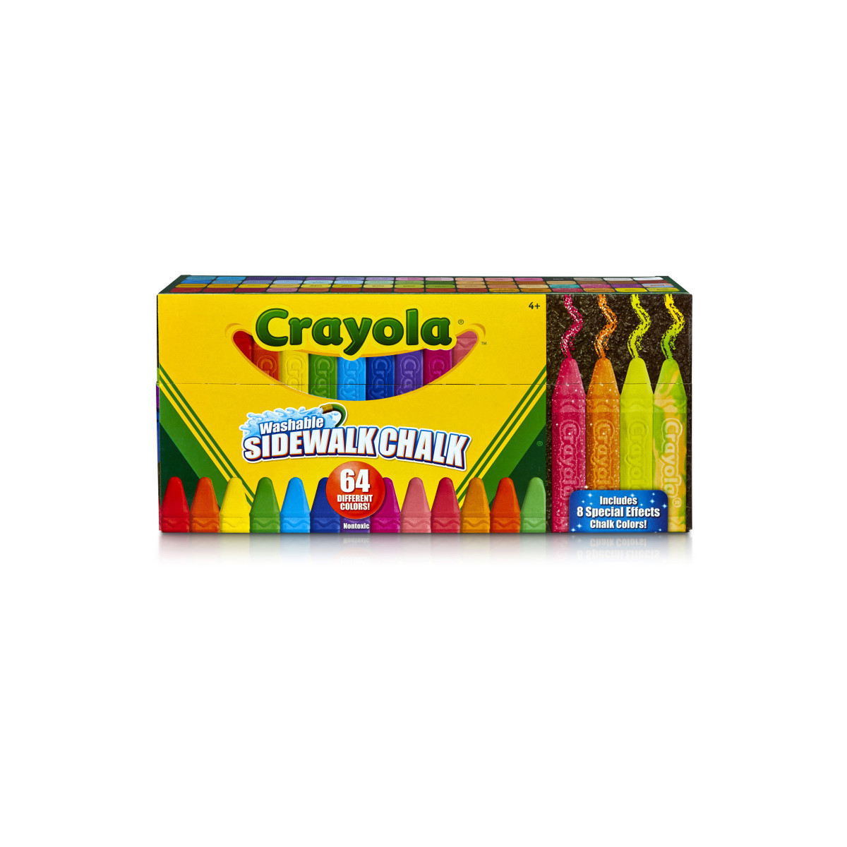 This collection includes a total of 64 chalk sticks made up of 56 vibrant hues and eight special-effects chalk sticks (2 each of tie-dye, neon, glitter, and neon glitter) so you can unleash your imagination and create all kinds of drawings and designs. The sticks are also great for writing messages or marking out hopscotch and other games. Designed for ages four and up, the sticks have easy-grip bodies that hands of all sizes can handle and hold. Triangular tips help ensure smooth lines from all angles. Kids can also use the sides of the stick to shade or color in larger areas. The Crayola Washable Chalk Collection gets kids excited about spending time outside being creative. This interactive chalk kit encourages outdoor fun with friends and provides kids with an activity that helps them become more active, social, and creative. Whether drawing on the sidewalk, blacktop, or driveway, this chalk brings the fun outdoors. The nontoxic chalk in this Crayola set completely washes away easily from sidewalk, blacktop, and driveway surfaces with water from a garden hose, bucket, or rainfall. Each pack includes 64 chalk sticks (56 classic colors and eight special-effects colors).