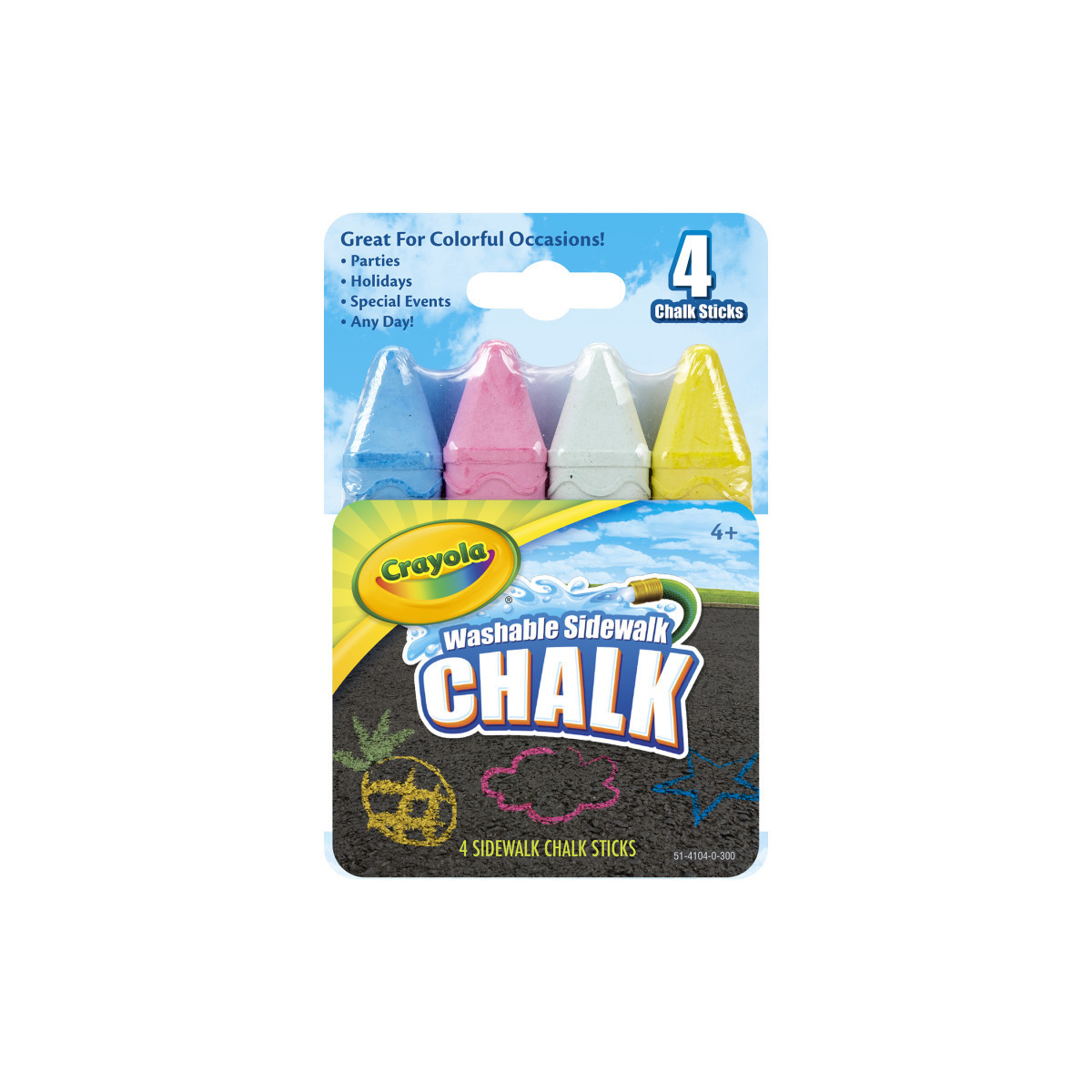 Crayola Washable Sidewalk Chalk sticks are the perfect art tools to create BIG outdoor art with a select color assortment for your special occasions—parties, holidays, special events and more! It's everything you need to decorate the day for a sidewalk celebration! Includes 4 sidewalk chalk sticks in popular colors for any occasion. Washable Sidewalk Chalk washes away with a garden hose or the next rainfall.