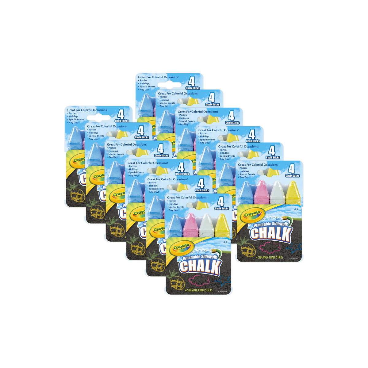 Crayola Washable Sidewalk Chalk sticks are the perfect art tools to create BIG outdoor art with a select color assortment for your special occasions—parties, holidays, special events and more! It's everything you need to decorate the day for a sidewalk celebration! Washable Sidewalk Chalk washes away with a garden hose or the next rainfall. Each pack includes 4 sidewalk chalk sticks in popular colors for any occasion. Sold as 12 packs for a total of 48 chalk sticks.