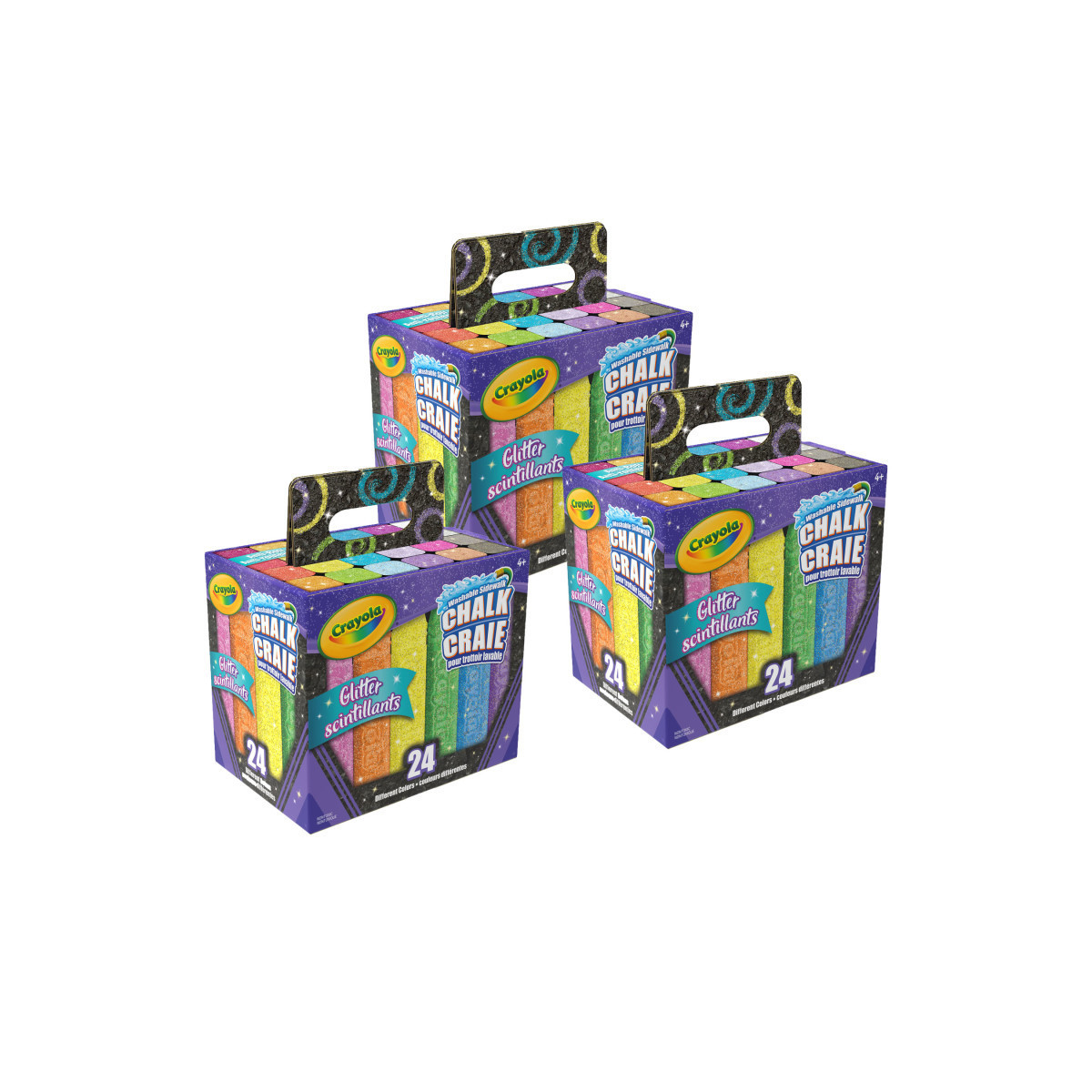 MULTI-PACK: Each set includes 24 dazzling Glitter Chalk sticks in bright and bold colors, each with its own special glitter effect. Sold as 3 packs for a total of 72 chalk sticks.
