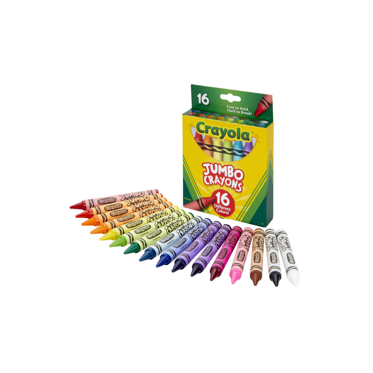 Crayola Jumbo Crayons are easy to hold and hard to break. They're perfect for the little hands of young artists. And their large size means more long-lasting color! Now Jumbo Crayons come in a 16-count pack that includes primary and secondary colors and more—8 more colors than the original pack!