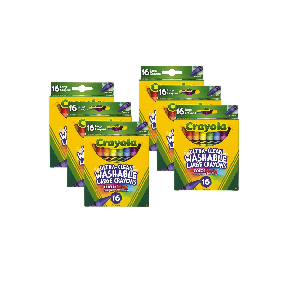 These Crayola Large Washable Crayons have a creamy, easy-glide texture with tapered points that are perfect for developing good writing habits. With an array of bright colors to choose from, kids can print, draw and color for hours of creative and educational fun. These crayons have an oversized, easy-grip that gives kids control and precision when they draw and color. Specially designed to create less mess, these non-toxic crayons feature an Ultra-Clean washable formula, so they easily wash clean from skin, clothing, and even painted walls. Each box includes 16 Crayola Large Washable Crayons in classic colors. Sold as 6 boxes for a total of 96 crayons.