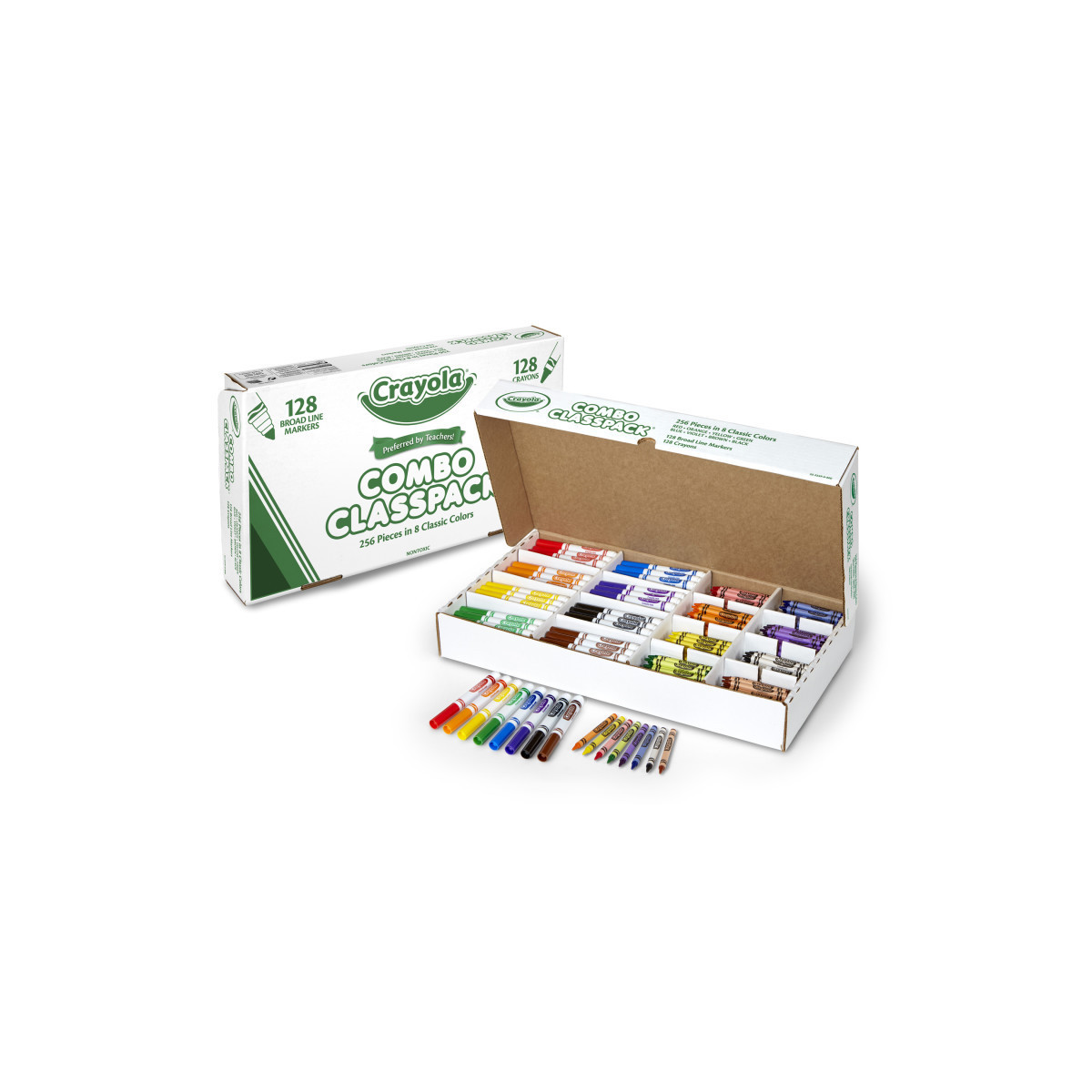 Combining two Crayola classics into one affordable pack! This Crayons & Markers Combo Classpack includes crayons and markers in 8 different colors. There are 128 crayons, 16 of each color and the same amount for the markers. That's 256 total pieces, enough for the whole class!