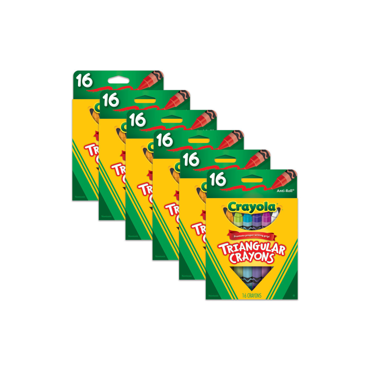 Guides little fingers toward a writing grip. Washable Triangular Crayons are the right shape to help guide toddlers fingers into the tripod position for more purposeful and controlled drawing. As children approach 24 months, they begin to hold crayons with the thumb and two fingers. Their scribbles now look like the zigzags or tighter, more controlled circles. The tripod grip is important for developing later writing skills. Crayola Beginnings Washable Triangular Crayons are designed to easily wash off walls with just warm water and a sponge. Each box includes 16 crayons in a tray. Sold as 6 boxes for a total of 96 crayons.