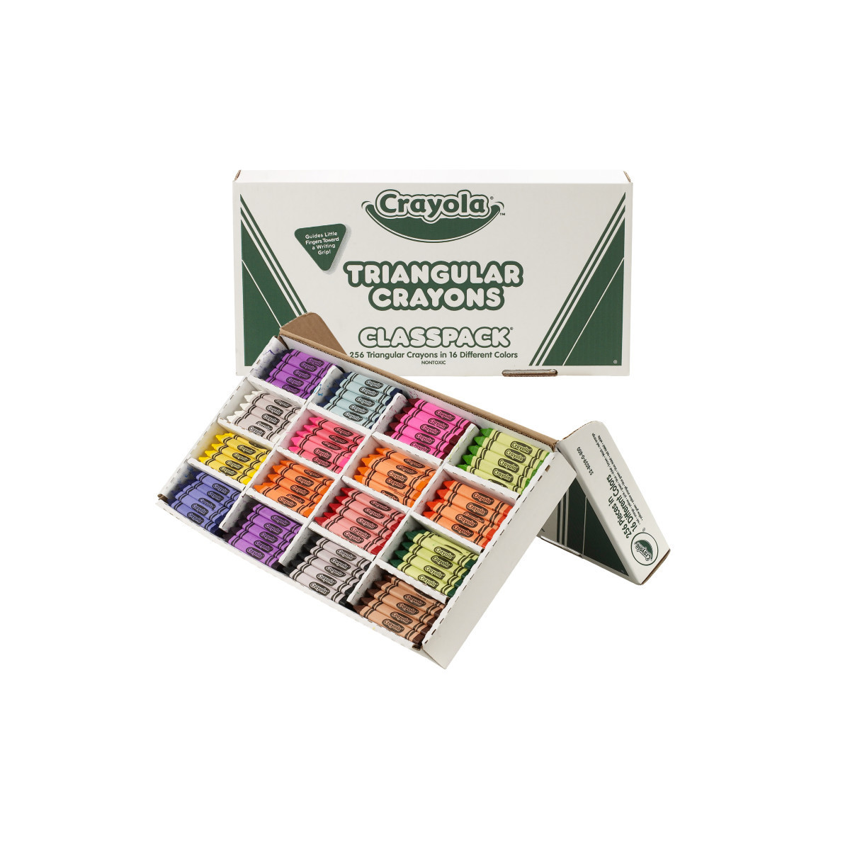 Introduce kids to the joys of color and coloring. These washable Crayola Triangular Crayons come in a wide variety of bright Crayola colors that encourage self-expression and teach kids about primary and secondary colors. The crayon's triangular shape is easy for little hands to hold and encourages the development of a proper writing grip. The design also prevents crayons from rolling off tables and desks. The pointed crayon tip makes it easier for kids to write and draw with accuracy and have more control when writing numbers or letters. This 256-crayon class pack has 16 sets of Crayola Triangular Crayons in 16 bright colors.