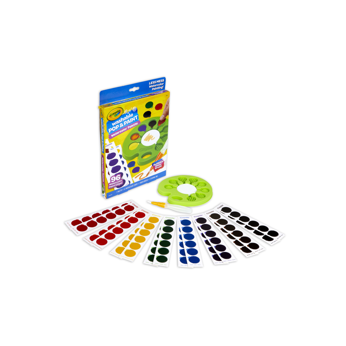 The Crayola Pop & Paint Watercolor Palette makes painting less messy and clean up a breeze! Each of the included 8 colors are printed on 96 disposable Watercolor Chips. Just pop out the chips, place them in the palette and use the Refillable Water Brush to activate the paint on each chip and you're ready to create! Simply discard used chips and pop in new ones as needed. No spilling paint or cups of water and colors are washable from skin and fabric. Create wherever you go! The reusable palette comes with a handy sponge to help clean your brush between colors and trap excess water. Features 96 Disposable Paint Chips, a Refillable Water Brush, Cleaning Sponge, and Reusable Paint Palette. Makes a great gift for boys and girls, ages 4 and up.
