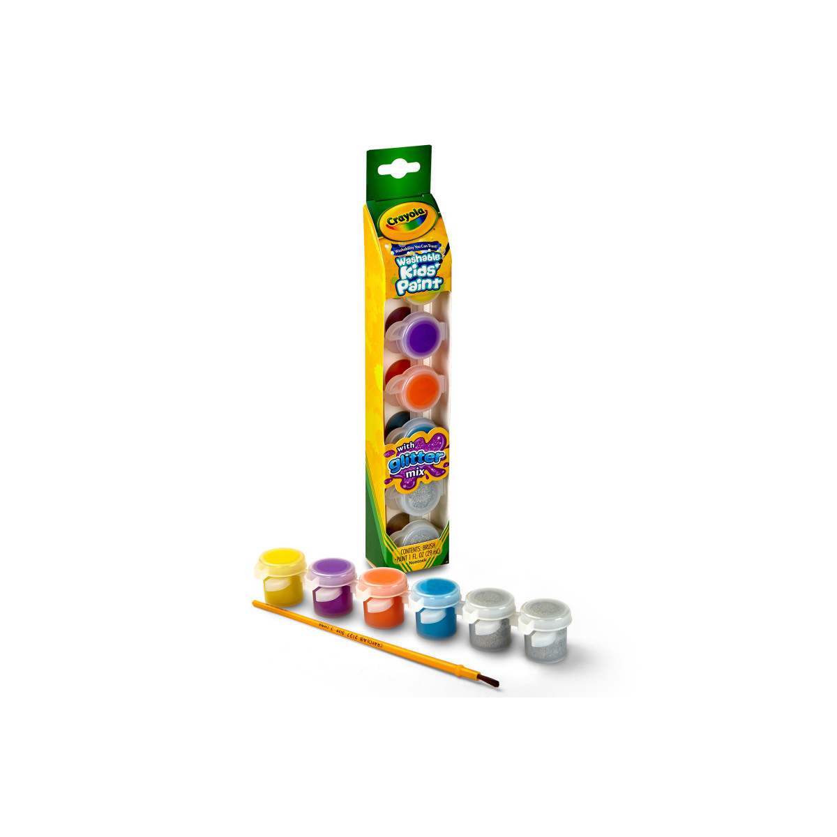 Add special sparkle effects to any art project with Crayola Washable Kids Paint with Glitter Mix! Each stroke of these kid friendly paints features rich color and a dazzling finish. Simply add sparkle mix to your desired paint color, mix with the included Crayola paint brush, and voila! Resealable pots and an ultra washable formula make this the perfect sparkle paint for arts and crafts, birthday parties, or classroom activities. Little artists will love adding sparkle to princesses, dragons, spaceships and more. Pair with Crayola Glitter Markers for even more sparkly fun! Crayola Washable Paint cleans easily from skin, surfaces, and most washable clothing. Safe and nontoxic kids paint set, age 3 and up.
