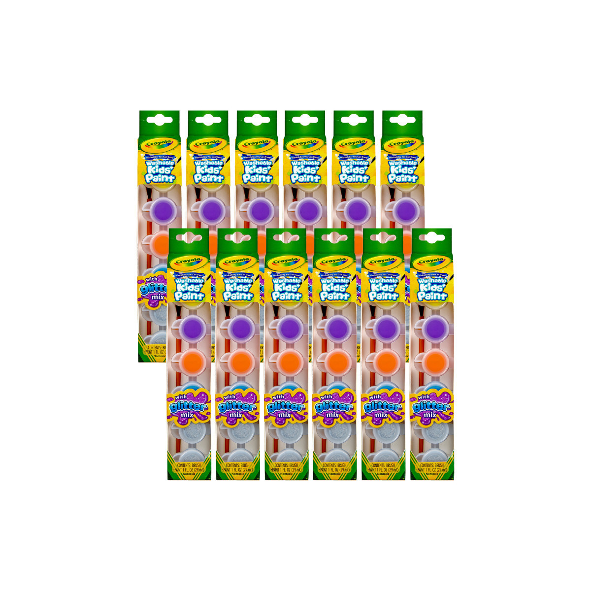 Add special sparkle effects to any art project with Crayola Washable Kids Paint with Glitter Mix! Each stroke of these kid friendly paints features rich color and a dazzling finish. Simply add sparkle mix to your desired paint color, mix with the included Crayola paint brush, and voila! Resealable pots and an ultra washable formula make this the perfect sparkle paint for arts and crafts, birthday parties, or classroom activities. Little artists will love adding sparkle to princesses, dragons, spaceships and more. Pair with Crayola Glitter Markers for even more sparkly fun! Crayola Washable Paint cleans easily from skin, surfaces, and most washable clothing. Safe and nontoxic kids paint set, age 3 and up. Each set includes 6 paint pots and a paintbrush. Sold as 12 sets for a total of 72 paint pots and 12 paintbrushes.
