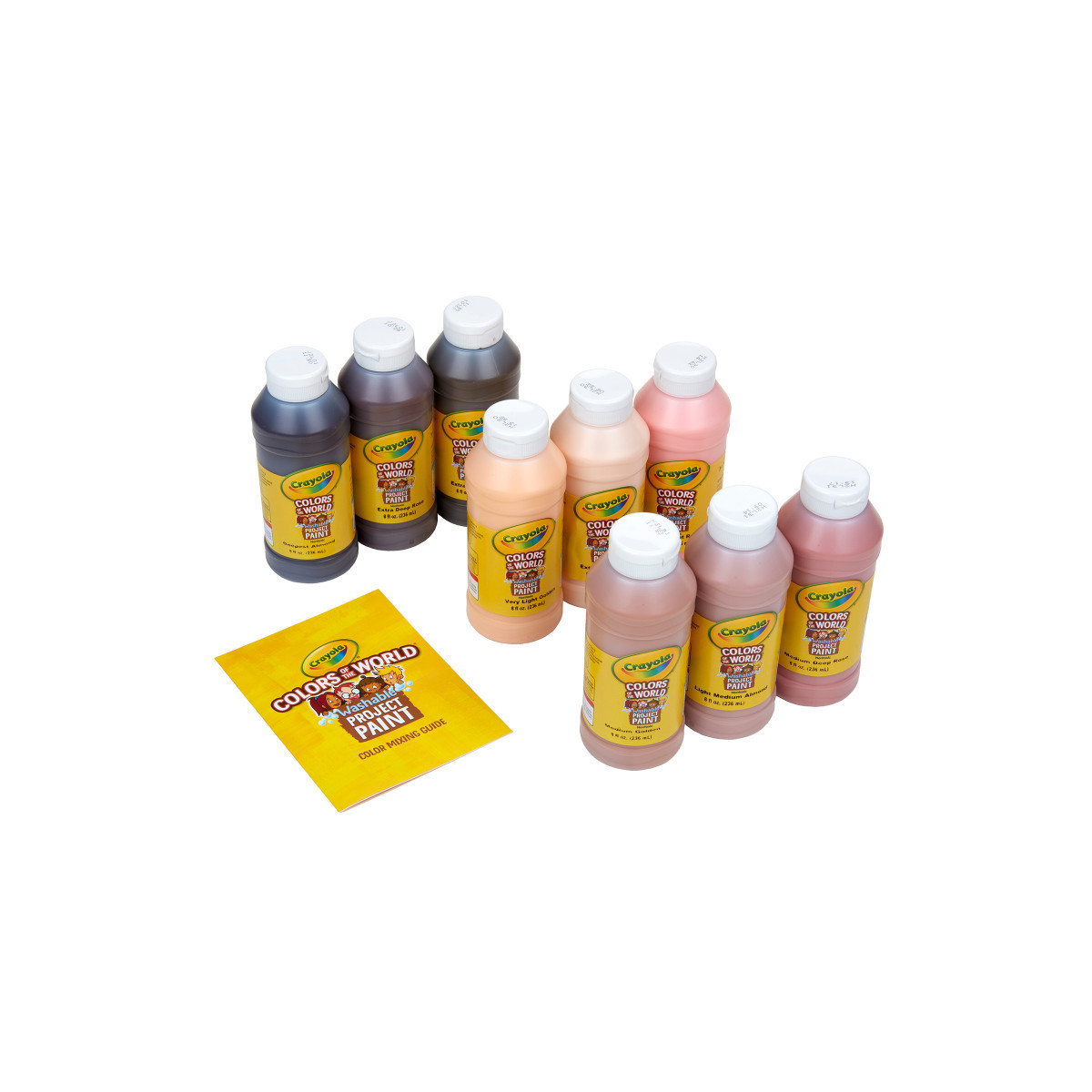 Express your creativity with this Crayola Colors of the World Washable Kids Paint Set in 9 resealable 8-ounce bottles. This worry-free Project Paint provides hours of fun and cleans up easily. Children can choose from a range of ten skin tone paints created to mirror authentic skin colors. Designed to inspire, this pack of Crayola Multicultural Kids Paint is perfect for activities on diversity and self-awareness. Each washable color is specially formulated to wash cleanly from skin and most washable clothing. This paint set for kids is great to have on hand for school projects, crafts, and creative play. Pair with Crayola Colors of the World Crayons for even more creative, customized fun. Safe and nontoxic, ideal for children ages 3 & up.