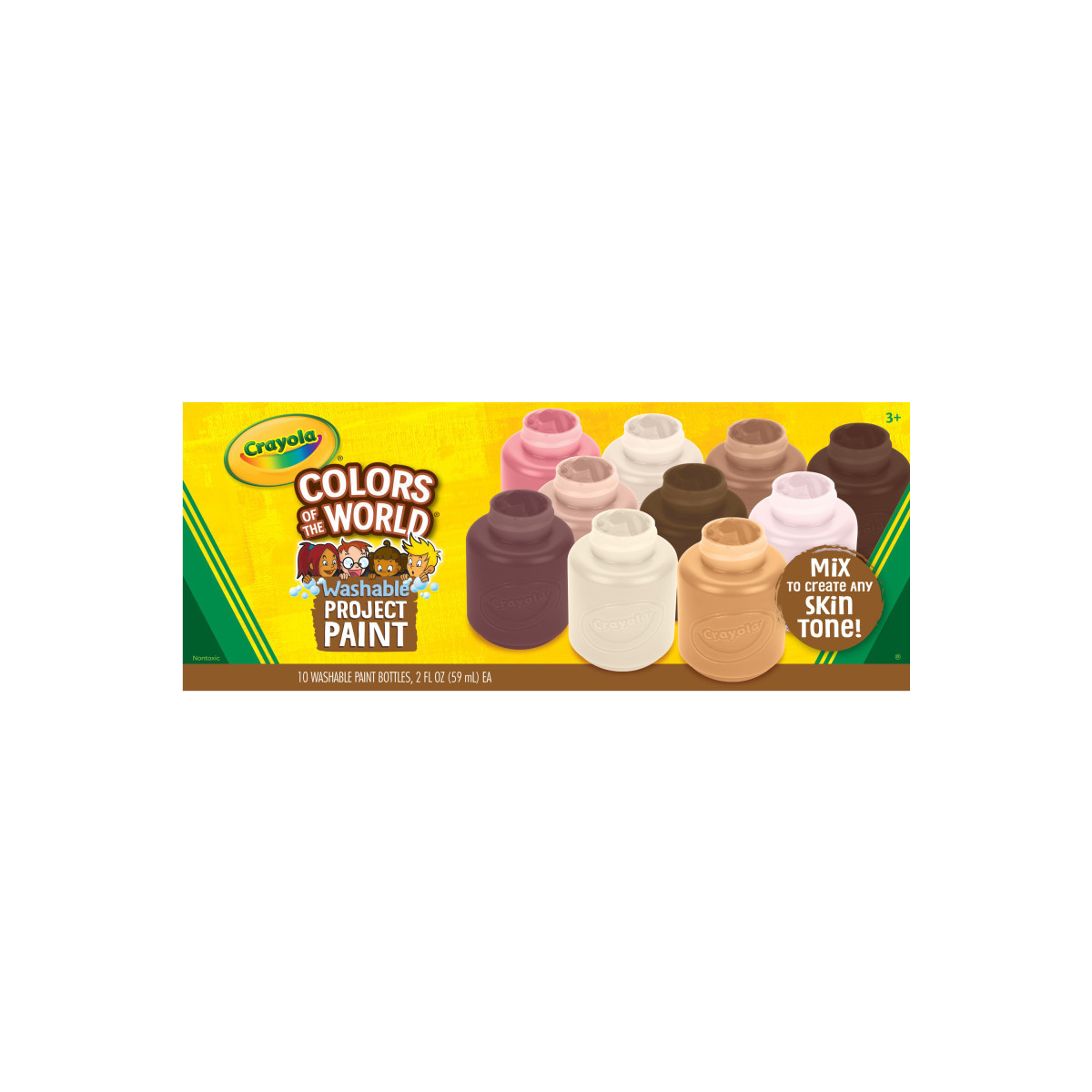 Express your creativity with this Crayola Colors of the World Washable Kids Paint Set. This worry-free Project Paint provides hours of fun and cleans up easily. Children can choose from a range of ten skin tone paints created to mirror authentic skin colors. Designed to inspire, this pack of Crayola Multicultural Kids Paint is perfect for activities on diversity and self-awareness. Each washable color is specially formulated to wash cleanly from skin and most washable clothing. This paint set for kids is great to have on hand for school projects, crafts, and creative play. Pair with Crayola Colors of the World Crayons for even more creative, customized fun. Safe and non-toxic, ideal for children ages 3 & up. Each pack includes 10 resealable 2-ounce bottles: Extra Light Almond, Light Medium Almond, Medium Deep Almond, Deepest Almond, Very Light Rose, Medium Deep Rose, Extra Deep Rose, Very Light Golden, Medium Golden and Extra Deep Golden.