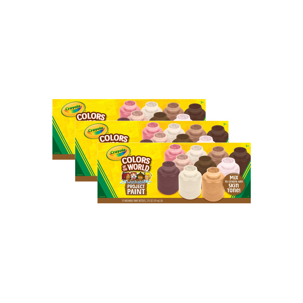 Express your creativity with this Crayola Colors of the World Washable Kids Paint Set. This worry-free Project Paint provides hours of fun and cleans up easily. Children can choose from a range of ten skin tone paints created to mirror authentic skin colors. Designed to inspire, this pack of Crayola Multicultural Kids Paint is perfect for activities on diversity and self-awareness. Each washable color is specially formulated to wash cleanly from skin and most washable clothing. This paint set for kids is great to have on hand for school projects, crafts, and creative play. Pair with Crayola Colors of the World Crayons for even more creative, customized fun. Safe and non-toxic, ideal for children ages 3 & up. Each pack includes 10 resealable 2-ounce bottles: Extra Light Almond, Light Medium Almond, Medium Deep Almond, Deepest Almond, Very Light Rose, Medium Deep Rose, Extra Deep Rose, Very Light Golden, Medium Golden and Extra Deep Golden. Sold as 3 packs for a total of 30 bottles of paint.