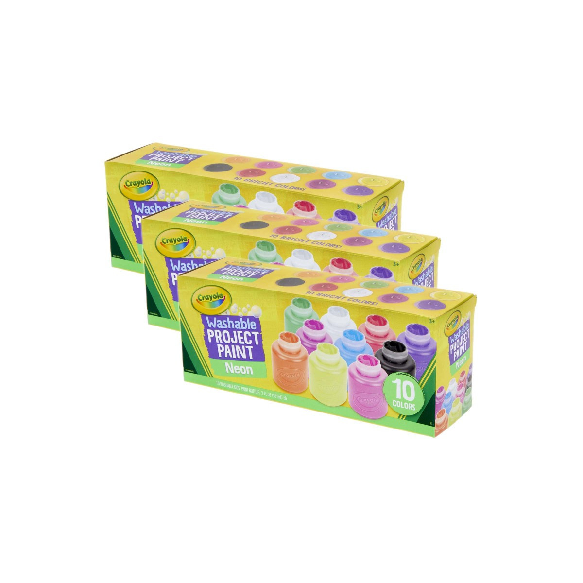 Add a bolt of neon color to creative masterpieces. Crayola Washable Neon Paints are nontoxic and great for arts and crafts, plus school projects. Decorate book covers, signs, or posters, and use various brushes, stamps, or sponges to create fun patterns and designs. Each pack includes 10 (2 oz) Paint Bottles in Radical Red, Blue Attitude, Unmellow Yellow, Purple Pizzazz, Shocking Pink, Atomic Tangerine, Mad Magenta, Screamin' Green, Black Night, and Winter White. Sold as 3 packs for a total of 30 bottles.