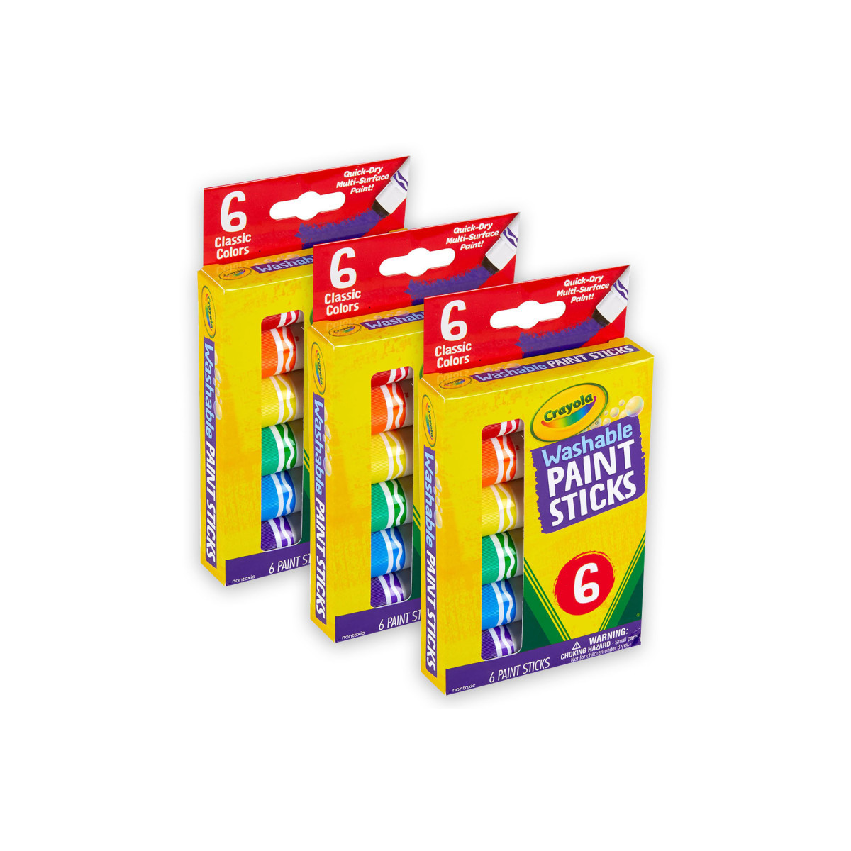 CRAYOLA KIDS PAINTS: Each less mess kids paint set includes 6 Paint Sticks in classic colors. Sold as 3 packs for a total of 18 paint sticks.