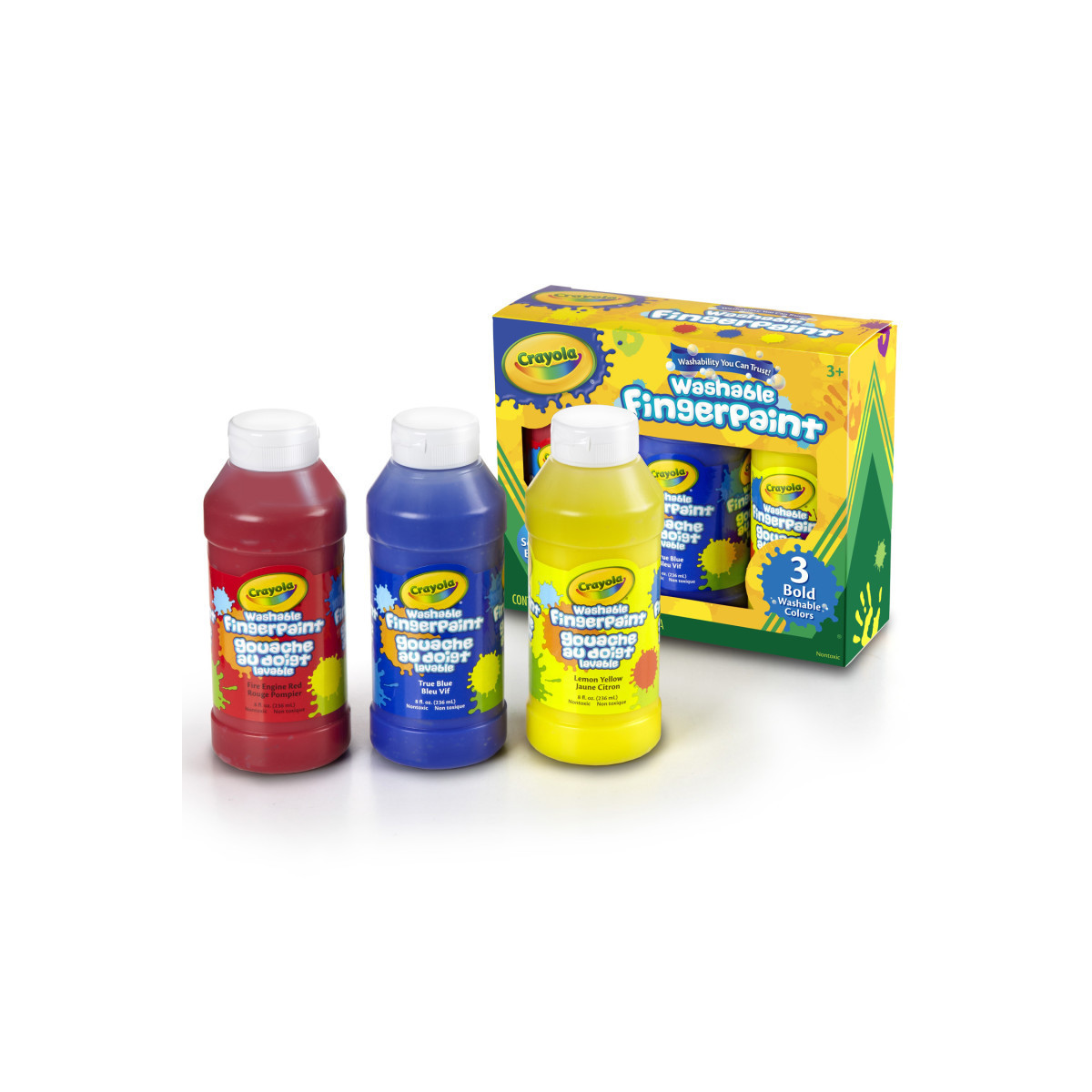 Bright, bold fingerpaints formulated to wash easily from skin and clothing. Includes 3 primary colors: Red, Blue, Yellow. Colors are mixable to a full color palette. Bottles are squeezable and have a convenient flip-top cap.