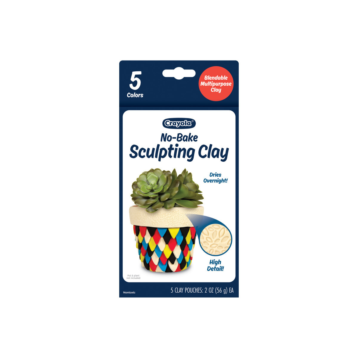 Experience the joy of crafting with the Crayola 5ct No Bake Sculpting Clay. This craft set offers a versatile art experience with its no bake clay. Each pouch contains a different color of clay: red, yellow, blue, black, and white. Included are 5 (2oz) sculpting clay pouches that can be stored in a plastic baggy or resealable container for multiple uses. Create vibrant, detailed works of art and easily blend together colors of the buttery soft clay. The clay also holds fine details as it dries and adheres to multiple surfaces including paper products, cardboard, wood, and other clay surfaces.