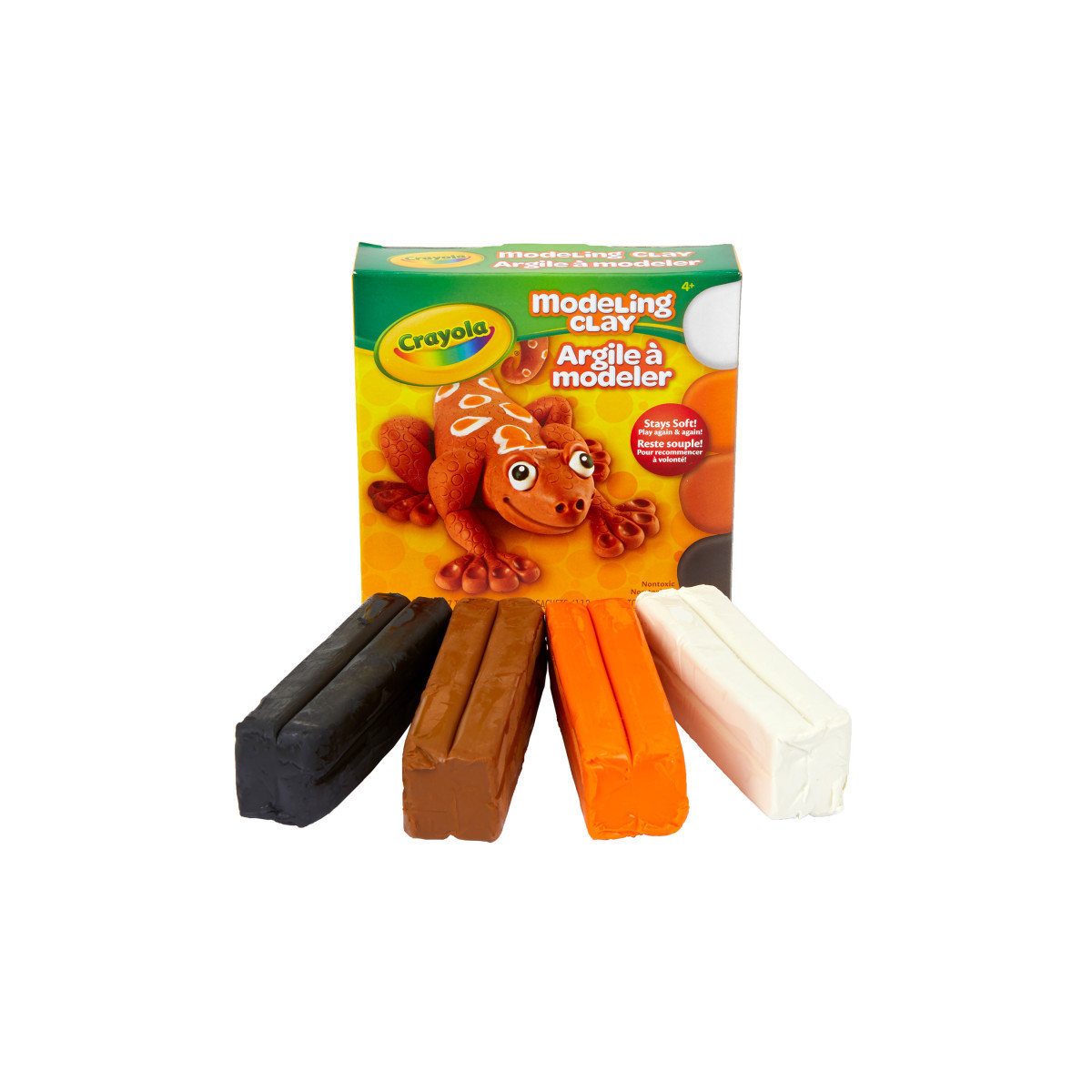 Tactile, easy to work with, and soft to the touch, Crayola Modeling Clay is designed especially for kids' hands. The clay makes an ideal first sculpting compound and can help children develop an early sense of form and finesse. These vibrant colors are great for sculpting play houses, figures, flowers, and more. Completely nontoxic, the clay is safe and suitable for young children ages 36 months and up. The clay is also designed to scrape easily off most surfaces, making cleanup a breeze. Each pack includes 1 lb. in 4 colors: white, black, orange and light brown.