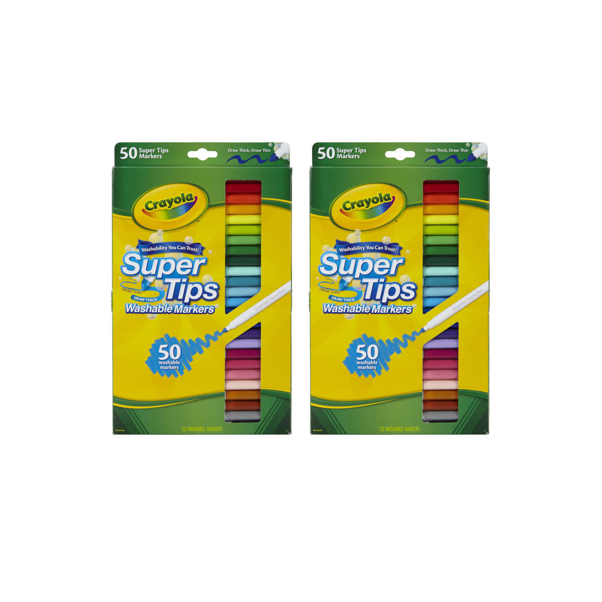 Thanks to the specially designed conical tips, Crayola SuperTips Washable Markers give you the versatility to use them for thin line drawing as well as for thick lines while coloring in large areas. Featuring vibrant ink that won't bleed, Crayola SuperTips Washable Markers are a great choice for any writing, drawing, or coloring project. Use these markers for shading, blending, and other coloring techniques for dramatic results. These nontoxic markers are safe for artists of any age. The formula easily washes off skin as well as most fabrics, so you can clean up quickly after arts and crafts time. Each pack includes 50 Washable Markers. Sold as 2 packs for a total of 100 markers.