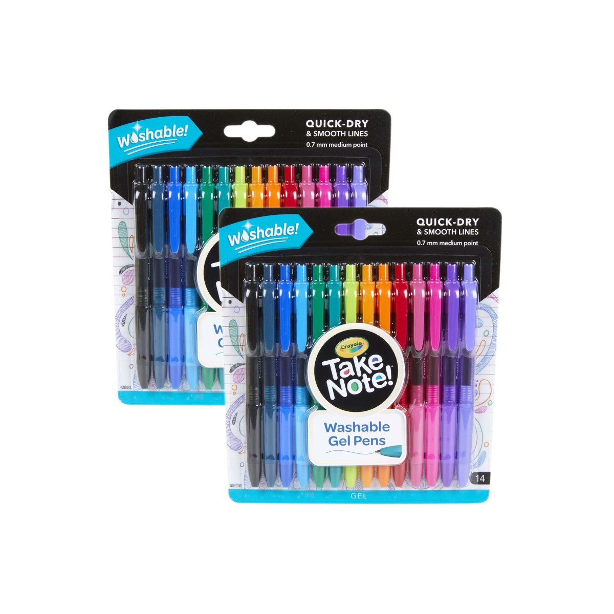 Create vibrant art and notes with Take Note! washable gel pens from Crayola. Each washable gel color lays down smooth and streak-free with a cool click of these ergonomic, cushioned-gripped pens. Create colorful special effects with the washability you expect from Crayola. Perfect for taking notes, art projects and organizing documents by color. Each pack includes 14 washable gel pens in unique, vibrant colors. Sold as 2 packs for a total of 28 pens.
