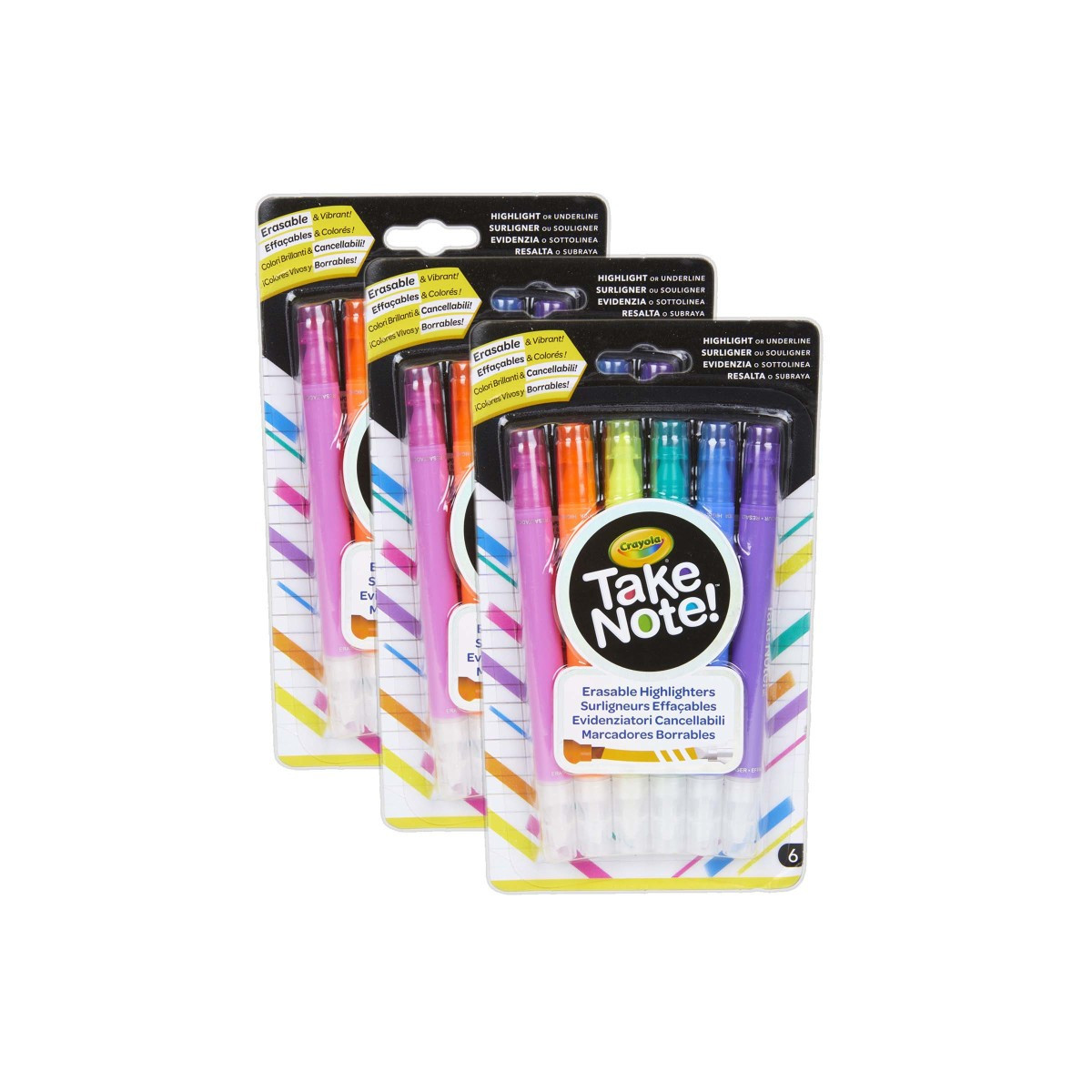 Highlight and erase in 6 vibrant colors—without damaging books or documents! The Crayola® Take Note! erasable highlighters have bright colors on one end, with clear ink tips on the other end for magically erasing the colorful highlights. No more worrying about highlighting the wrong word or over-highlighting a page! For 6 years and up. Each pack includes 6 dual-tipped erasable highlighter markers in 6 different colors. Sold as 3 packs for a total of 18 highlighters.
