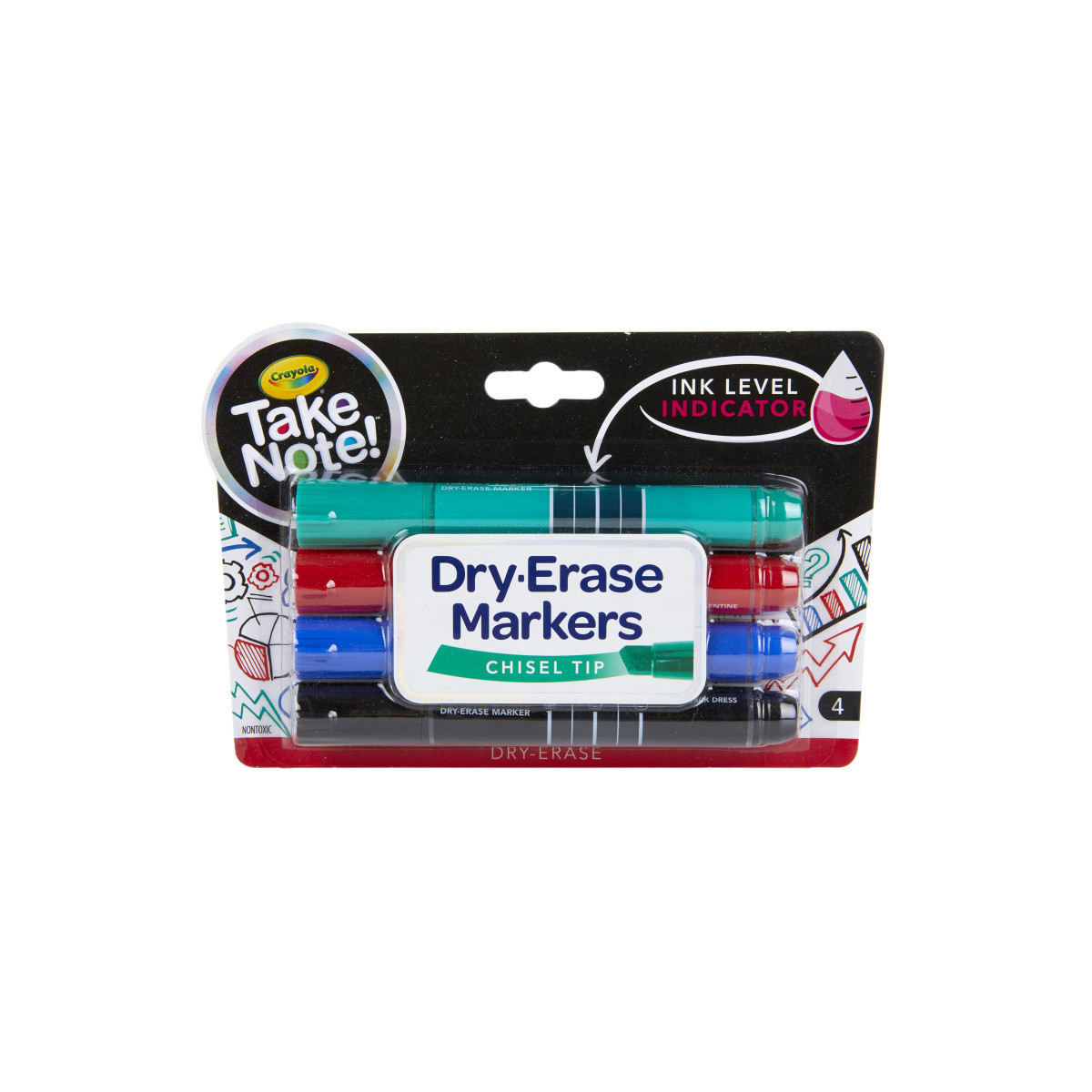 Crayola Take Note Dry-Erase Markers are quick to dry but easy to erase! Vibrant colors are great for bold messages on most white boards. Each marker has a chisel tip that is perfect for thick or thin lines and features an ink level indicator so you always know when it's time to restock. The markers are low odor, making them ideal for classrooms, offices, and meeting rooms. Includes 4 Crayola Take Note Dry Erase Markers in Black, Blue, Red, & Green