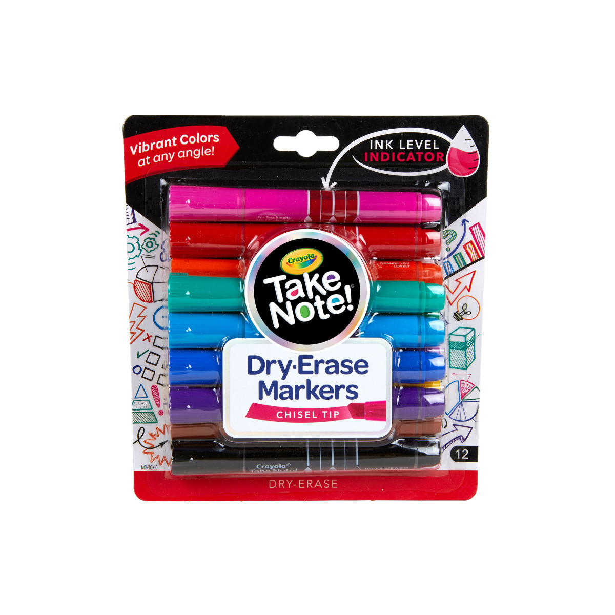 Crayola Take Note Dry-Erase Markers are quick to dry but easy to erase! Vibrant colors are great for bold messages on most white boards. Each marker has a chisel tip that is perfect for thick or thin lines and features an ink level indicator so you always know when it's time to restock. The markers are low odor, making them ideal for classrooms, offices, and meeting rooms. Includes 12 broad line Take Note Dry Erase Markers in assorted colors.