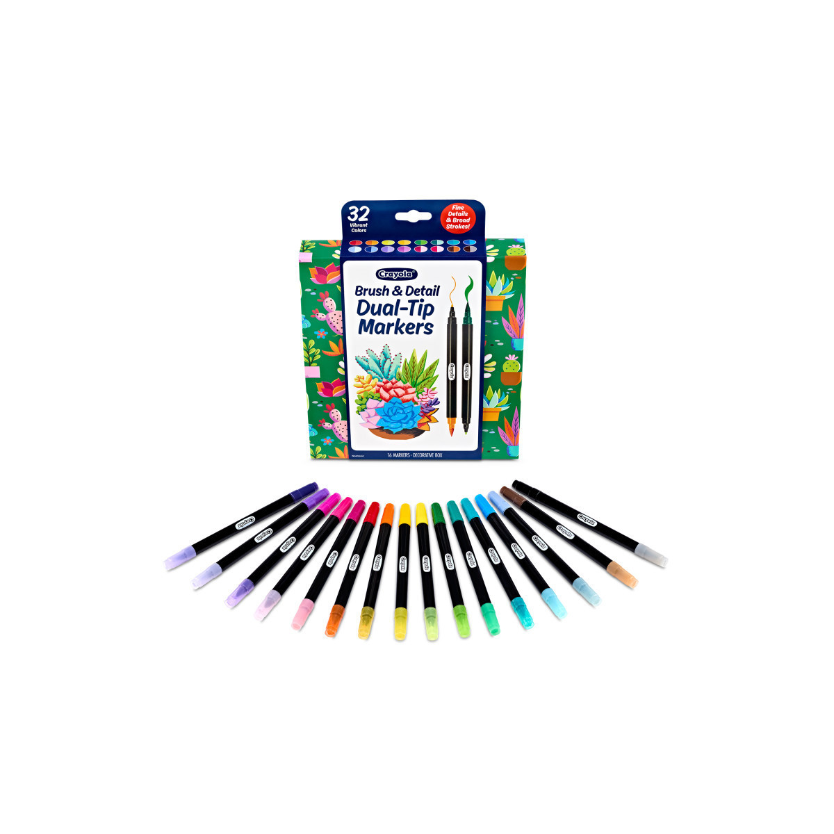 Discover the joy of artistry with the Crayola 16 count Brush & Detail Dual-Tip Markers. This set offers a versatile coloring experience with its dual-tip markers. Each marker features a flexible brush tip for brushstroke control, allowing for broad, paint-like strokes. The dual-tip markers also feature an ultra-fine tip for precision detailing, making it easier than ever to create crisp edges and clean lines. The art marker set features a wide color range with 16 dual-ended markers, providing a total of 32 vibrant colors. The water-based markers allow for easy blending with other water-based mediums. These markers are perfect for journaling, artistic creations, and adult coloring. The nontoxic nature of these markers ensures safe use, making them an excellent gift for various occasions.