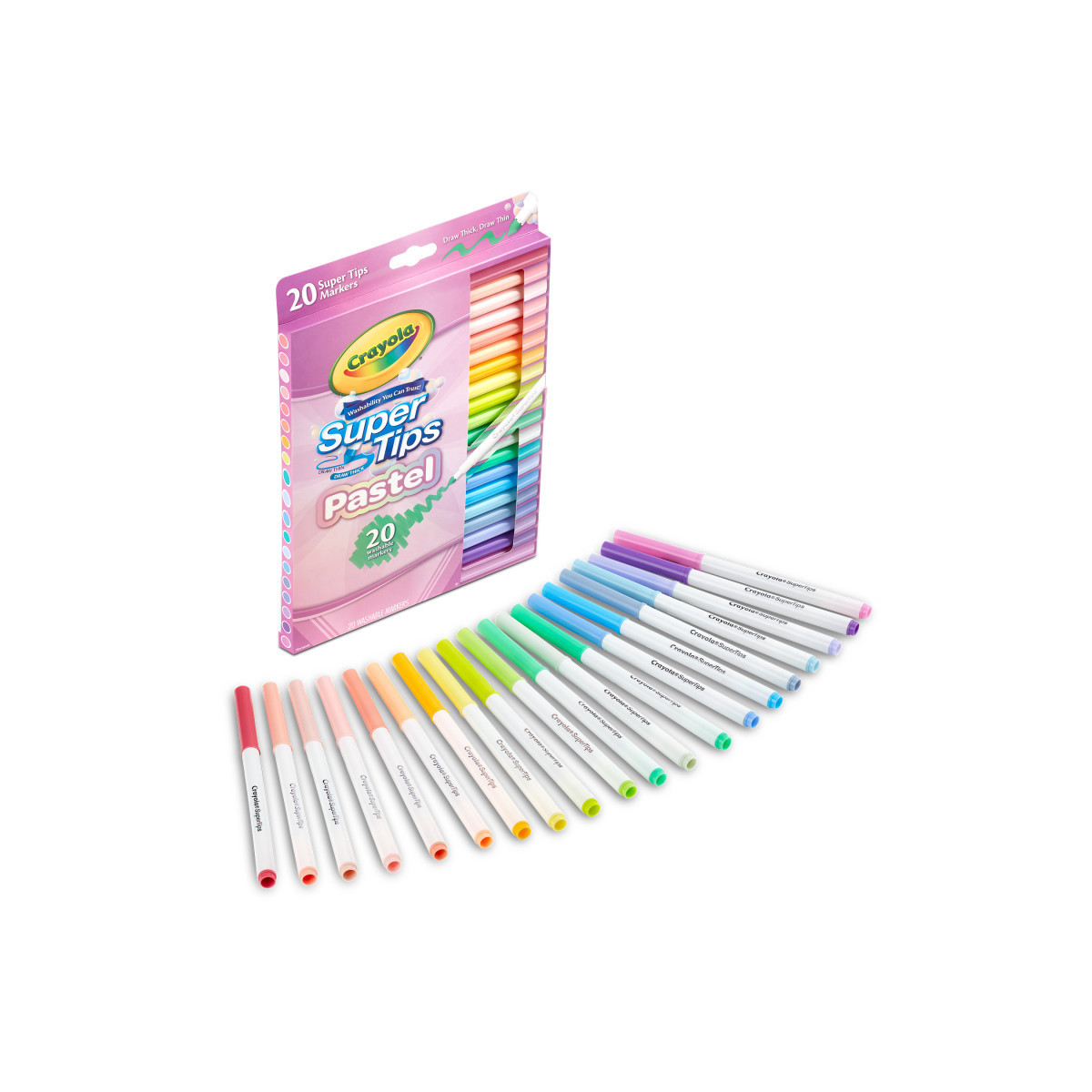 Add a splash of pastel color to your artwork with Crayola Pastel Supertip Washable Markers! This 20 count pack includes a variety of soft pinks, blues, and greens, perfect for adding a touch of whimsy to your school projects, coloring books, and crafts. The durable Supertips design allows you to create both thick and thin lines, making these markers versatile for all your drawing and writing needs. Plus, with the washable formula, you won't have to worry about stains on skin or washable clothing. Stock up on these long-lasting markers, designed to provide endless creativity without drying out easily. These markers are also AP certified nontoxic, making them safe and child-friendly. Perfect for kids ages 4 and up, these Pastel Supertip Markers make a great gift for any young artist.