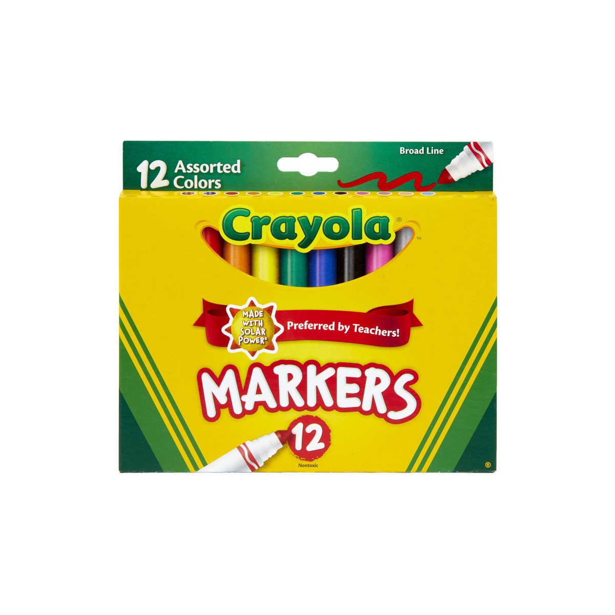 This assortment of markers features classic Crayola colors with high-quality, true-to-color ink. Add bold, vibrant color to artwork, school assignments, and other creative projects. The variety of bright, classic colors in this pack invites imaginative expression. Crayola Broad Line Markers have sturdy conical tips that make them ideal for a variety of classroom and group art projects. Great for coloring in large areas, these markers also work well for drawing thin lines or dots. Broad-line markers lay down plenty of color and won't smudge or bleed through paper. Crayola Markers contain recycled plastic resin, which keeps hundreds of tons of plastic out of landfills every year. Bring beauty and color to your world and help keep plastic out of landfills. Crayola art supplies and activities help children express, create, and connect through colorful play. Each box includes 12 Crayola Broad Line Markers in assorted colors.