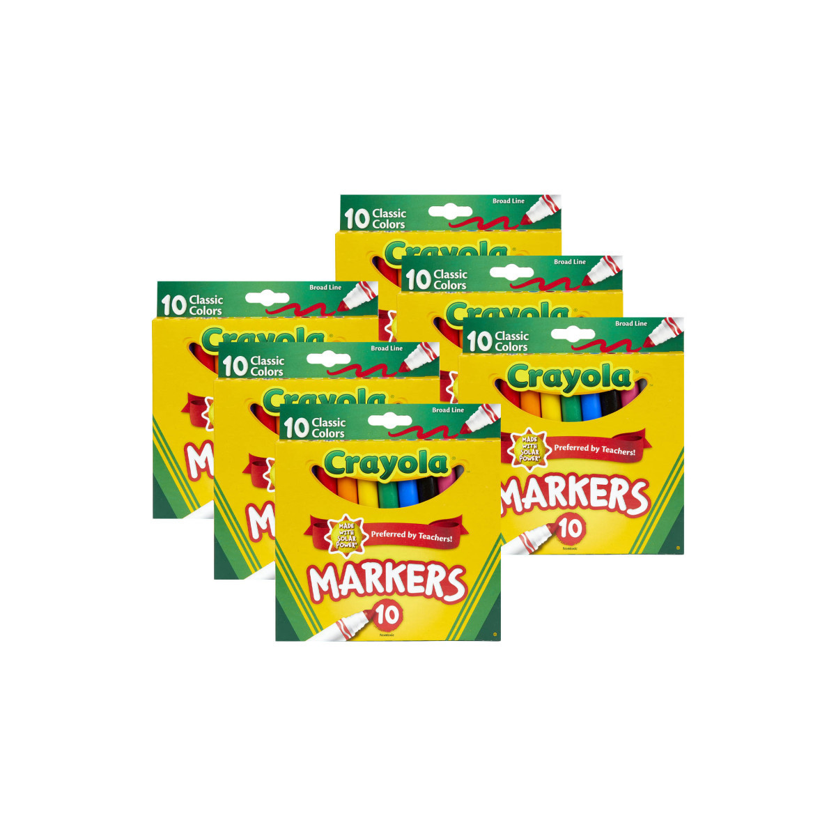 This assortment of markers features 10 classic Crayola colors with high-quality, true-to-color ink. Add bold, vibrant color to artwork, school assignments, and other creative projects. The variety of bright, classic colors in this pack invites imaginative expression. Crayola Broad Line Markers have sturdy conical tips that make them ideal for a variety of classroom and group art projects. Great for coloring in large areas, these markers also work well for drawing thin lines or dots. Broad-line markers lay down plenty of color and won't smudge or bleed through paper. Crayola Markers contain recycled plastic resin, which keeps hundreds of tons of plastic out of landfills every year. Bring beauty and color to your world and help keep plastic out of landfills. Crayola art supplies and activities help children express, create, and connect through colorful play. Each box includes 10 Crayola Broad Line Markers in Classic Colors. Sold as 6 boxes for a total of 60 markers.